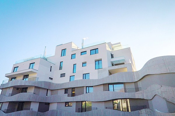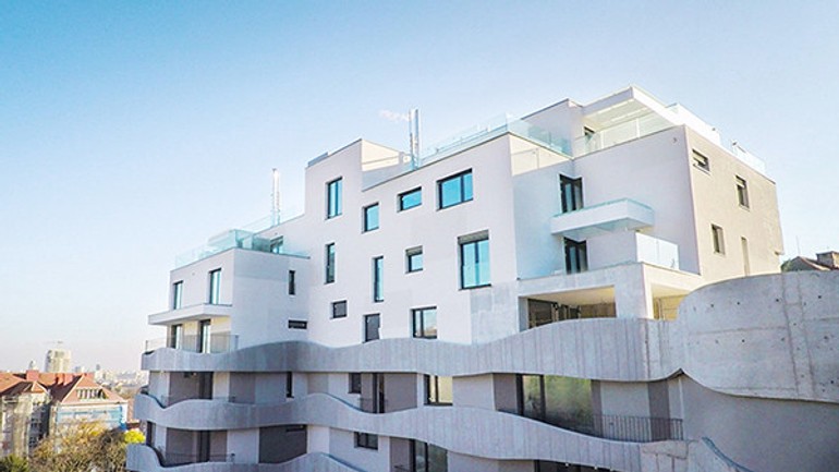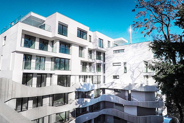 Stavbou zasadenou v strmom svahu nás detailne sprevádza technický dozor investora, Boris Dobrodenka zo spoločnosti ENG2. Ukazuje nám, že objekt vďaka dômyselnému stvárneniu v svahovitom teréne vôbec nepôsobí na svojich 7 bytových poschodí. Umiestnenie bolo síce náročné pre stavbu, avšak pre celý projekt bolo prínosom. Veľkou výzvou bolo aj rozdelenie objektu dvoma typmi balkónových riešení. „Architekti použili netradičné konštrukcie zábradlí loggií, ktoré plynule prechádzajú do oporných múrov v teréne a majú tvar nepravidelných vĺn. Myslím, že takáto konštrukcia je na Slovensku použitá prvýkrát,“ hovorí Boris Dobrodenka. V hornej časti sú na balkónoch použité sklenené zábradlia. Tieto dva prístupy na nás pôsobia prekvapivo veľmi kompaktne. Pozitívne hodnotíme presun všetkých klimatizačných jednotiek na strechu, aby nenarúšali vzhľad fasády. Architektov chválime aj za plán sadových úprav, kde dômyselne kombinujú strohé betónové múry so zeleňou a vdychujú tak stavbe iný rozmer.