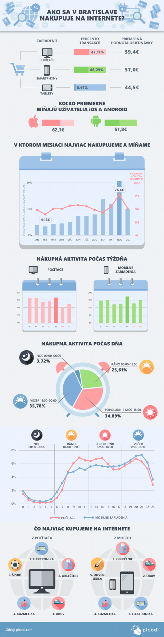 Čo sa týka časti dňa, ktorá je pri online nakupovaní najpopulárnejšia, je to, pochopiteľne, večer. V noci vykonajú Bratislavčania iba necelé 4 % z celkových nákupov. Najviac nakupujú Bratislavčania večer (od 18-tej hodiny do polnoci), je to takmer 36 %. Nákupná špička pri používateľoch počítačov a mobilov je okolo 20-tej hodiny večer.