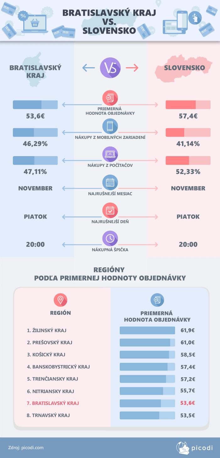 Bratislavský kraj sa teda umiestnil až na predposlednom 7. mieste, pokiaľ ide o priemernú hodnotu jedného nákupu, a rozdiel medzi Bratislavským krajom a prvým Žilinským krajom je až 8,28€. Pred Bratislavským krajom sa umiestnil Nitriansky kraj s náskokom 2,13€. Za Bratislavským krajom ostal už iba Trnavský kraj, v ktorom ľudia minú pri jednom online nákupe v priemere o 16 centov menej.