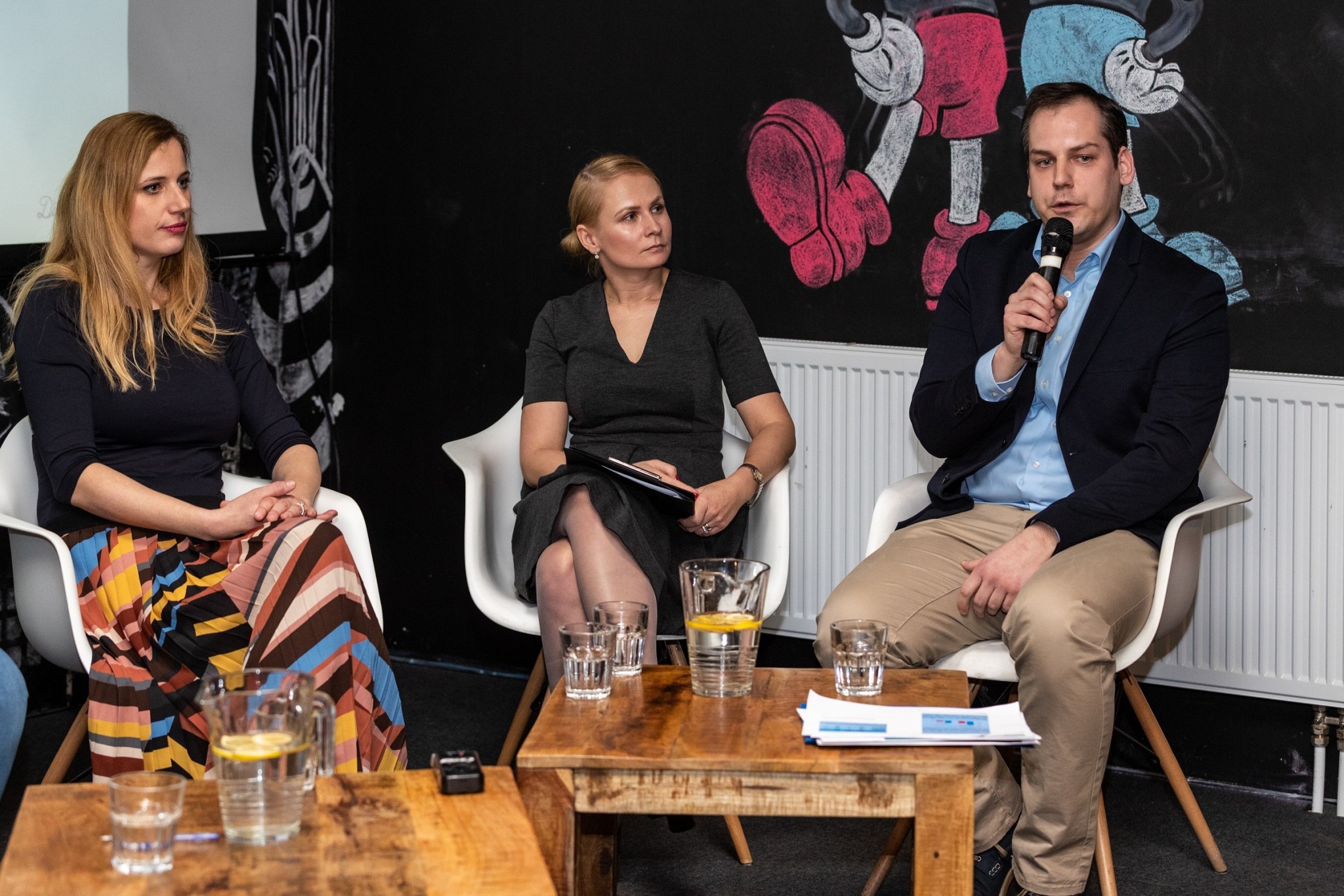 Barbora Kohútiková (Divé maky), Ladislava Molnárová, (Amrop Slovakia) a Slavomír Hidaš (Inštitút finančnej politiky) na tlačovej besede: