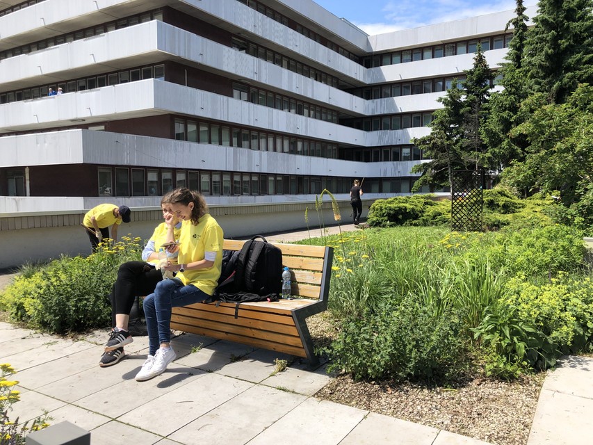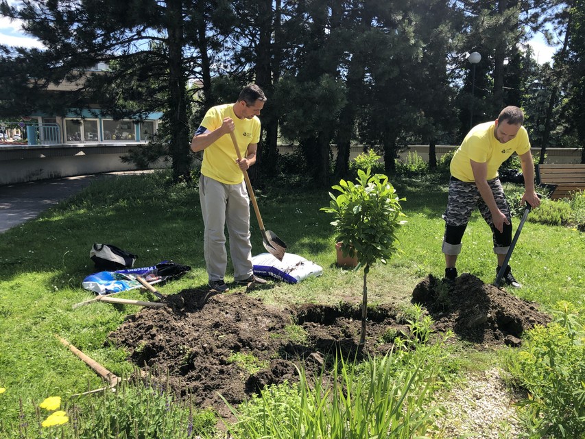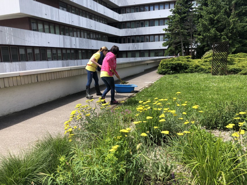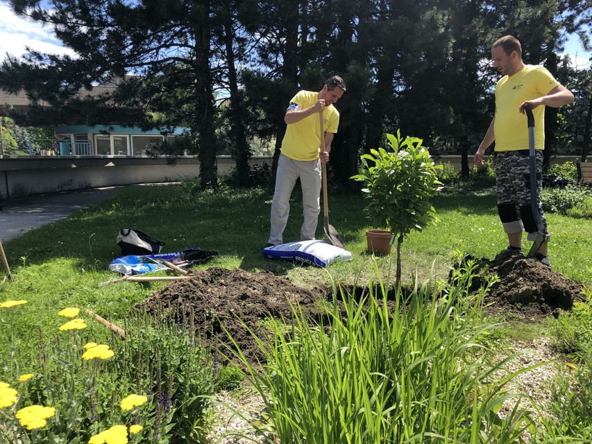 V spolupráci s OZ Amazonky a so Združením pacientov s hematologickými malignitami v Národnom onkologickom ústave na Klenovej zrevitalizovali parčík, kde budú môcť pacienti a ich návštevy relaxovať. „V záhrade sme odstránili staré kríky, haluze, šišky, ako aj drobný stavebný neporiadok. Zrevitalizovali sme trvalkové záhony či okopali záhony ruží. Vysadili sme kvitnúce stromy a kvety, napríklad krásnu červenú magnóliu a na stromy umiestnili vtáčie búdky a kŕmidlá, aby prilákali vtáčiky,“ prezradil nám pán Mušic, záhradník, ktorý sa o záhradné priestory Univerzitnej nemocnice stará a zveľaďuje už dlhé roky. Park v onkologickom ústave dokonca v minulosti aj zakladal. Spoluprácu s dobrovoľníkmi si veľmi pochvaľoval, podľa jeho slov mu toľko šikovných rúk v tento deň veľmi pomohlo a prácu ľudí je na celkovom vzhľade parku hneď poznať.