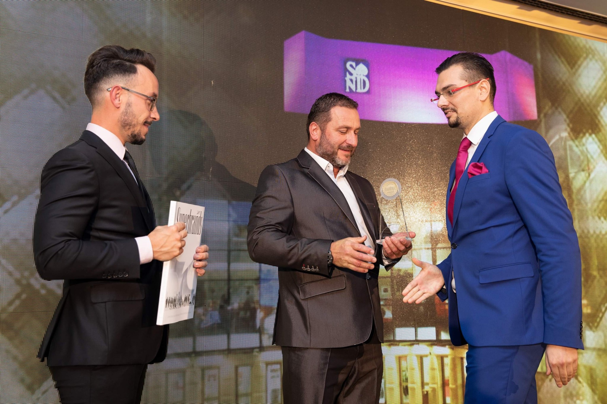 Erik Koronczi (regionálny manažér Slovak Superbrands, vľavo), János Gaál (BigMedia, uprostred) odovzdáva cenu Honorary Superbrand Branislavovi Stančekovi z SND (vpravo).