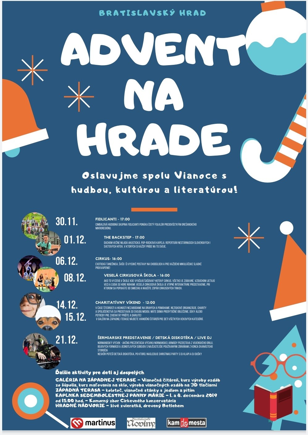 Mikulášsky deň si deti môžu užiť s malým cirkusom, ku ktorému sa cez víkend 7. a 8. decembra pridá aj predstavenie s klaunami či divadelné vystúpenie Vianočného príbehu. 14. a 15. decembra dáme priestor charitám a neziskovým organizáciam, ktoré nám pripomenú, že čas Vianoc je aj čas podať pomocnú ruku a rozdeliť sa s tými, ktorí mali v živote menej šťastia. Ak máte doma deky, oblečenie, hračky či veci pre zvieratká, ktoré už nemajú využitie, doneste ich cez víkend na hrad, budeme sa tešiť.