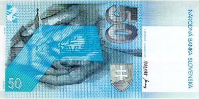 Na rubovej strane bankovky bol motív zobrazujúci dve ruky, medzi ktorými je prvých sedem písmen staroslovienskej abecedy hlaholiky ako symbol daru svätcov starým Slovanom. Zrkadlovo obrátená silueta stredovekého kostolíka z Dražoviec (okres Nitra) je symbolom raného kresťanstva na našom území:
