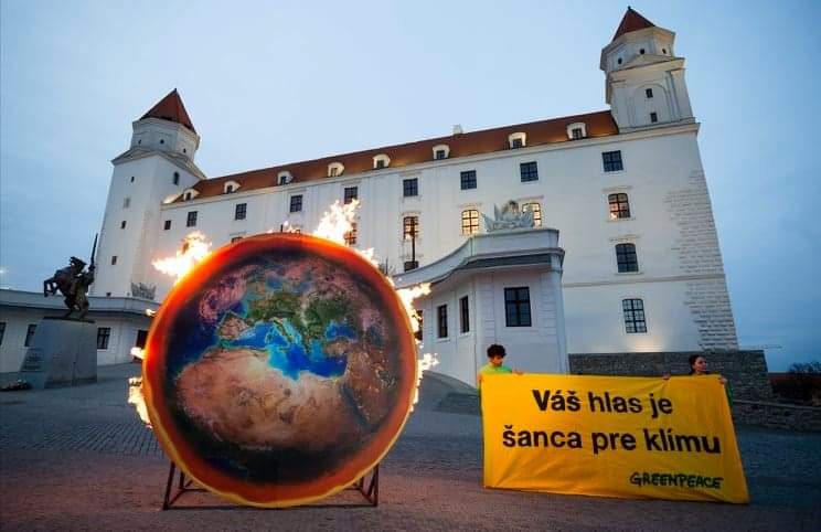 Organizácia Greenpeace Slovensko postavila v stredu pred Bratislavský hrad horiacu planétu Zem. Chcela tak upozorniť na dôležitosť tohtoročných parlamentných volieb v spojitosti s ochranou pred klimatickou krízou.