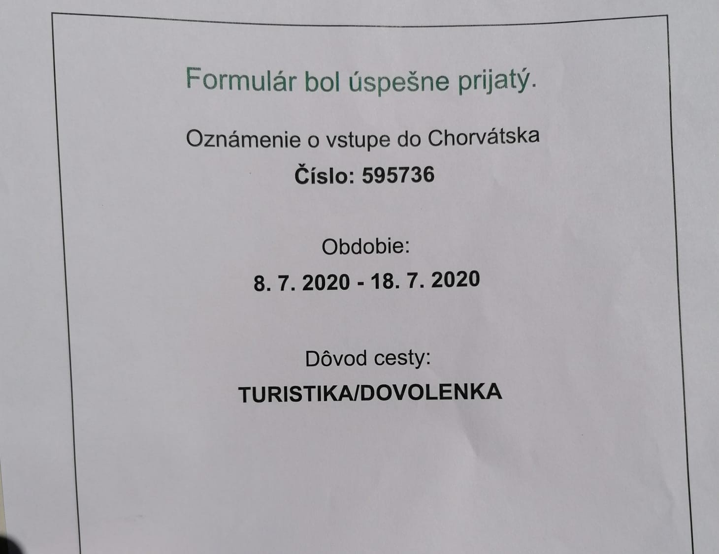 Pred cestou do Chorvátska si radšej vytlačte potvrdenie o vyplnení formulára. V ňom sú uvedené údaje o cestujúcich, adresa a čas pobytu.
