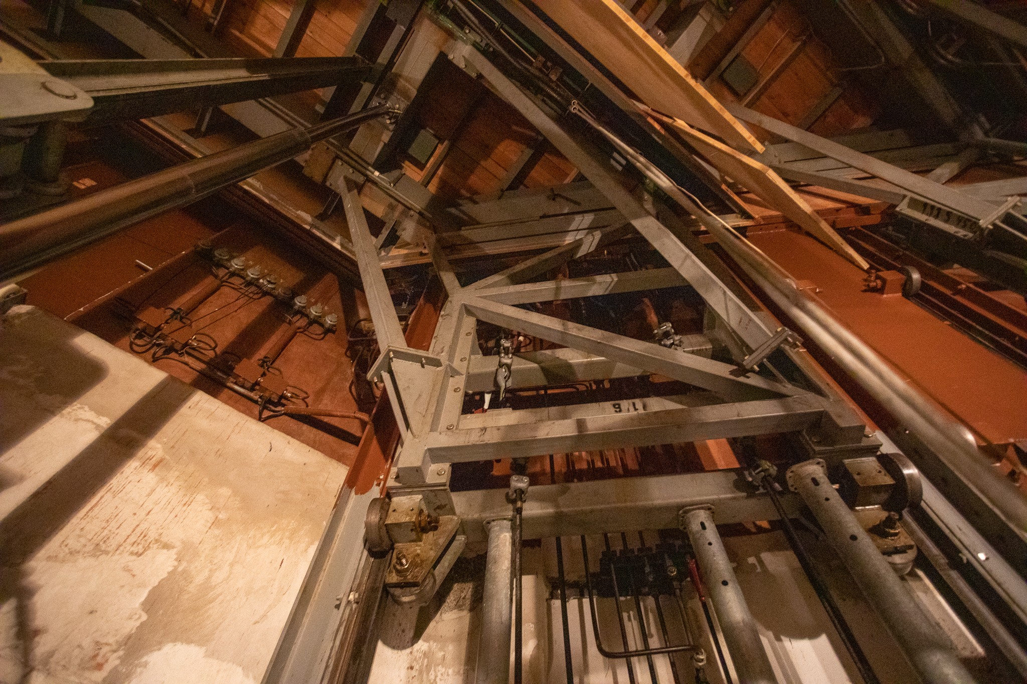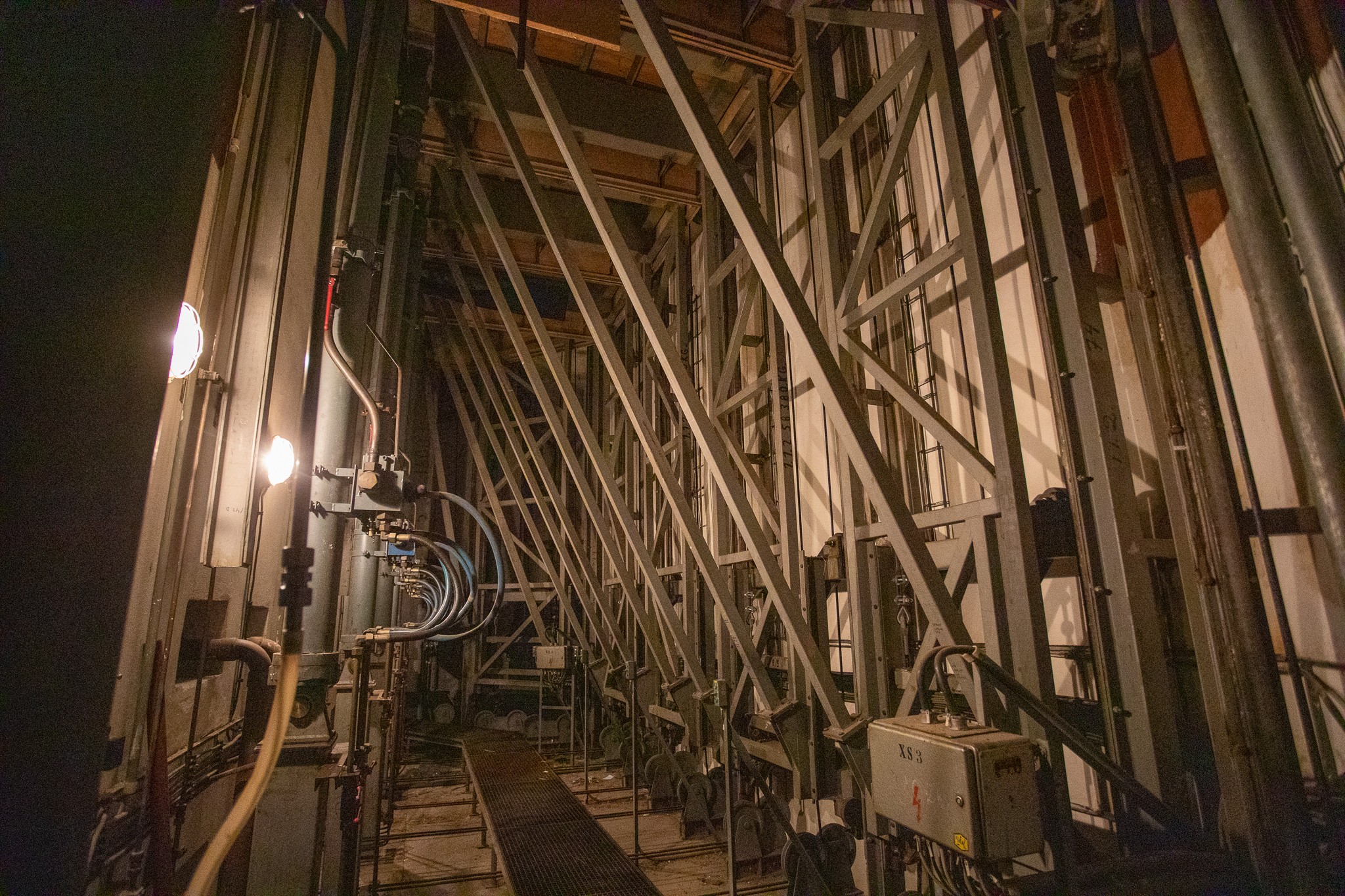 Hydraulické piesty sú vždy po dva párované na každý stôl a sú koordinované systémom lán. Dnes by sa to zariaďovalo na inej technickej báze.