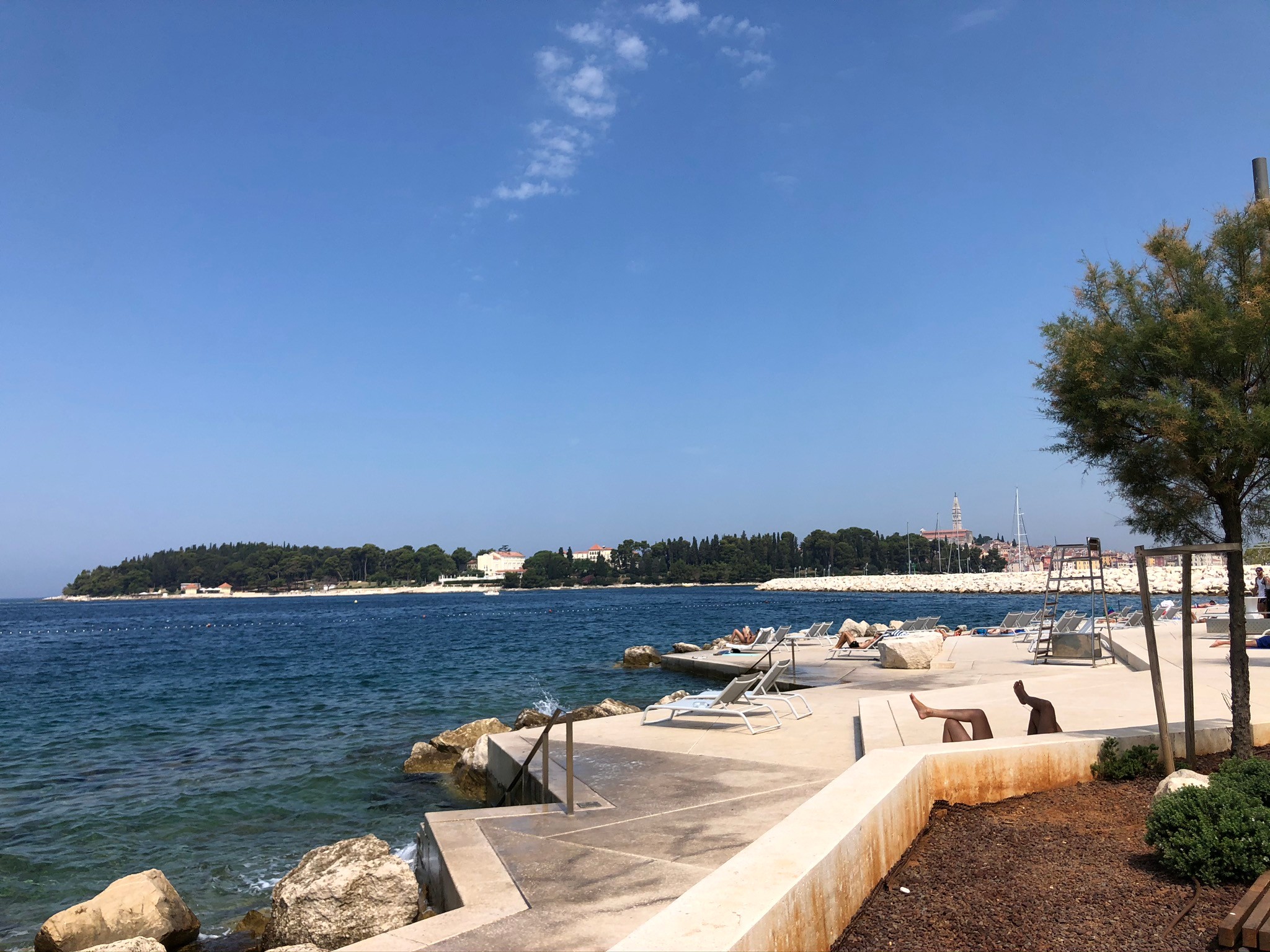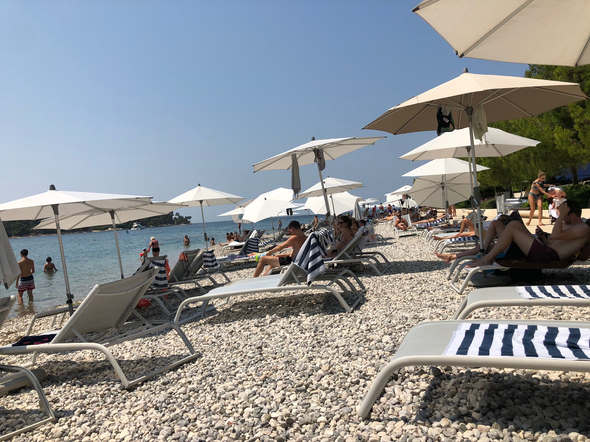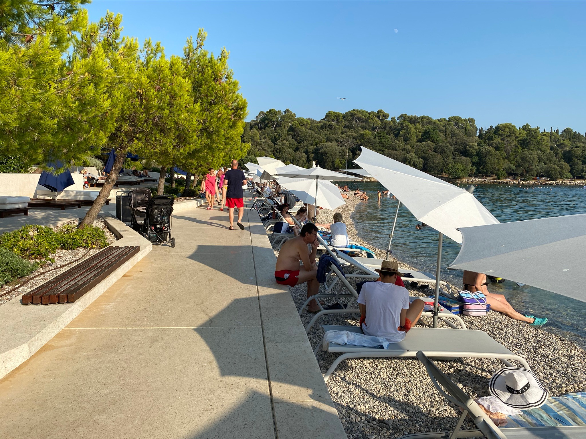 Trochu ďalej od centra je novovybudovaná štvrť s drahými hotelmi a k nim patria aj hotelové pláže, na ktorých sú ležadlá za poplatok. Tu sa sústredilo viac ľudí, avšak tiež sa dali nájsť miesta, kde skoro nikto nebol. Pri vstupe na tieto pláže však boli vyvesené informácie o maximálnom počte ležadiel, potrebných odstupoch a povinná dezinfekcia na ruky. Ceny sú vyššie aj za ležadlá, za dve ležadlá so slnečníkom zaplatíte 400 chorvátskych kún.
