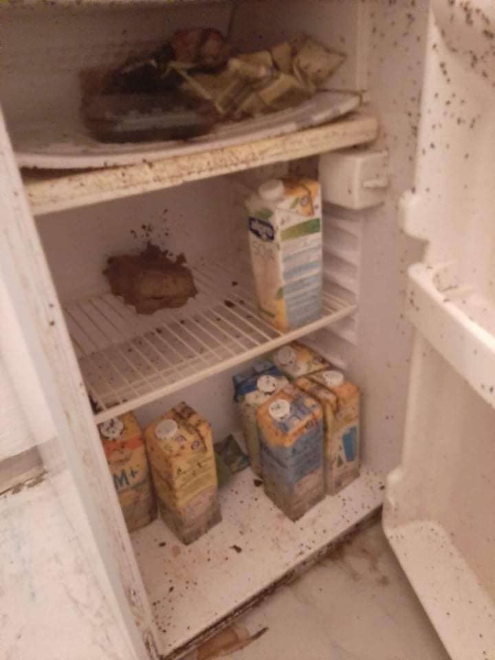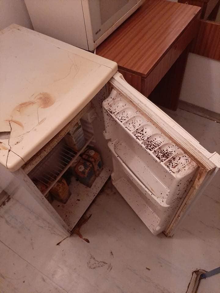 Chladnička na internátoch Mladosť Slovenskej technickej univerzity. Za stav sú iste neraz spoluzodpivední i študenti, ale ťažko uveriť, že tu niekto počas korona uzávery priestory dezinfikoval.