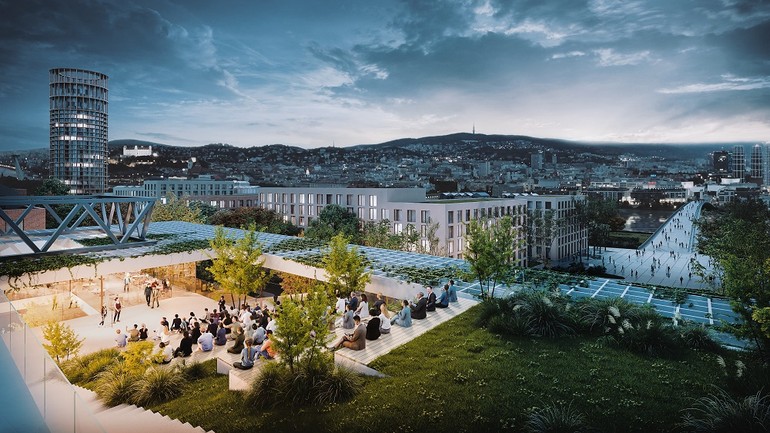 Autori návrhu chcú priniesť do centra Bratislavy aj unikátny strešný priestor s amfiteátrom. „Projekt umožňuje využiť strechu ako pobytovú terasu s pódiom a amfiteátrom, s výhľadom na dominanty mesta a rozšíri už tak široké spektrum priestorov, ktoré koncept ponúka,“ dodáva Juraj Benetin.