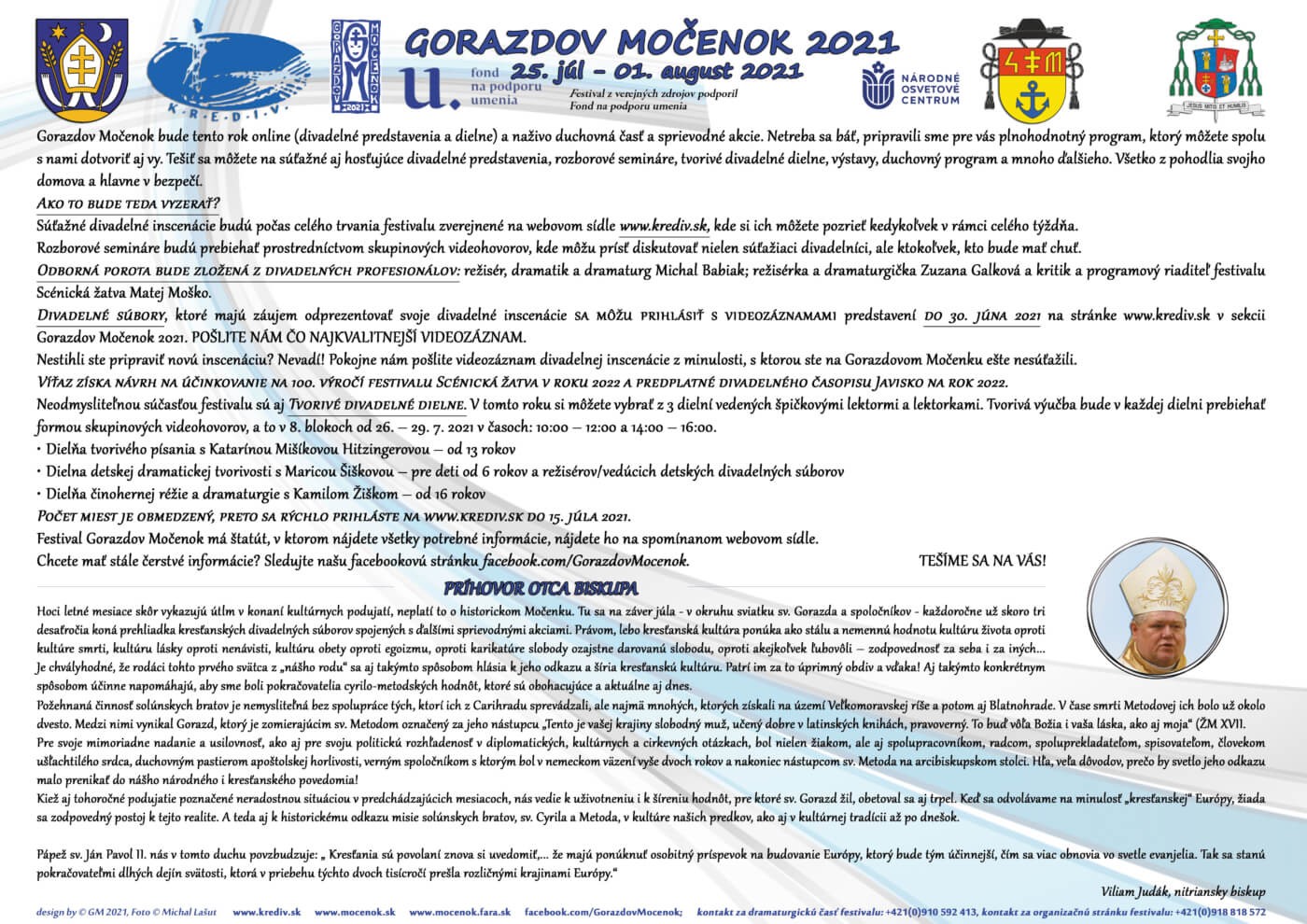 V dňoch 25. júla - 1. augusta 2021 sa uskutoční 29. ročník Celonárodného festivalu kresťanského divadla Gorazdov Močenok. Festival bude tento rok online (divadelné predstavenia a dielne) a naživo duchovná časť a sprievodné akcie.