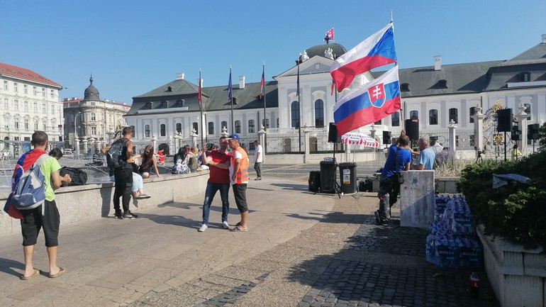 Pred Prezidentský palác sme sa prišli pozrieť okolo deviatej ráno. Všade na okolí môžete vidieť skupinky policajtov, demonštrantov zatiaľ veľmi nevidno. Hŕstka sa ich nachádza priamo na námestí (úvodné foto), diskutujú, ako ďalej postupovať. Na mieste vyvesili sliovenskú a českú vlajku, z reproduktorov im vyhrávala Tublatanka, konkrétne skladba Pravda víťazí.