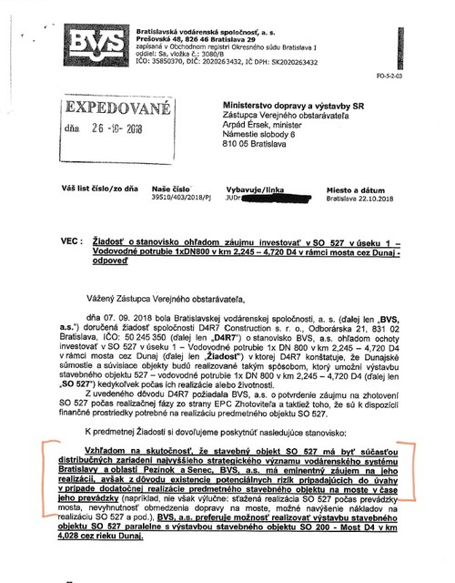 O stanovisko sme požiadali aj BVS. Spoločnosť popiera, že by konzorcium D4R7 voči nej vyvíjala akékoľvek aktivity, aby od zámeru vybudovať potrubie ústúpila a za rozhodnutím si stojí. A platiť by to mala z vlastného, na čo momentálne nemá. "BVS nemá v tejto lokalite potrubie, ktoré by bolo možné na objekt SO 527 napojiť. Teda by bolo nutné dobudovať relatívne dlhé prívodné potrubia, na ktoré BVS nemala v tom čase peniaze v rozpočte. Navyše vybudovanie tohto objektu nie je pre BVS priorita, nakoľko v tomto smere má vybudované hlavné aj záložné potrubie," reagoval na naše otázky Martin Podstupka z komunikačného oddelenia BVS s tým, že problém pri zásobovaní niektorých častí Bratislavy vodou nehrozí. "BVS má v tejto lokalite vybudované hlavné aj záložné potrubie v dostatočnej kapacite. Prioritou pre BVS je údržba týchto existujúcich vodovodov," dodal.