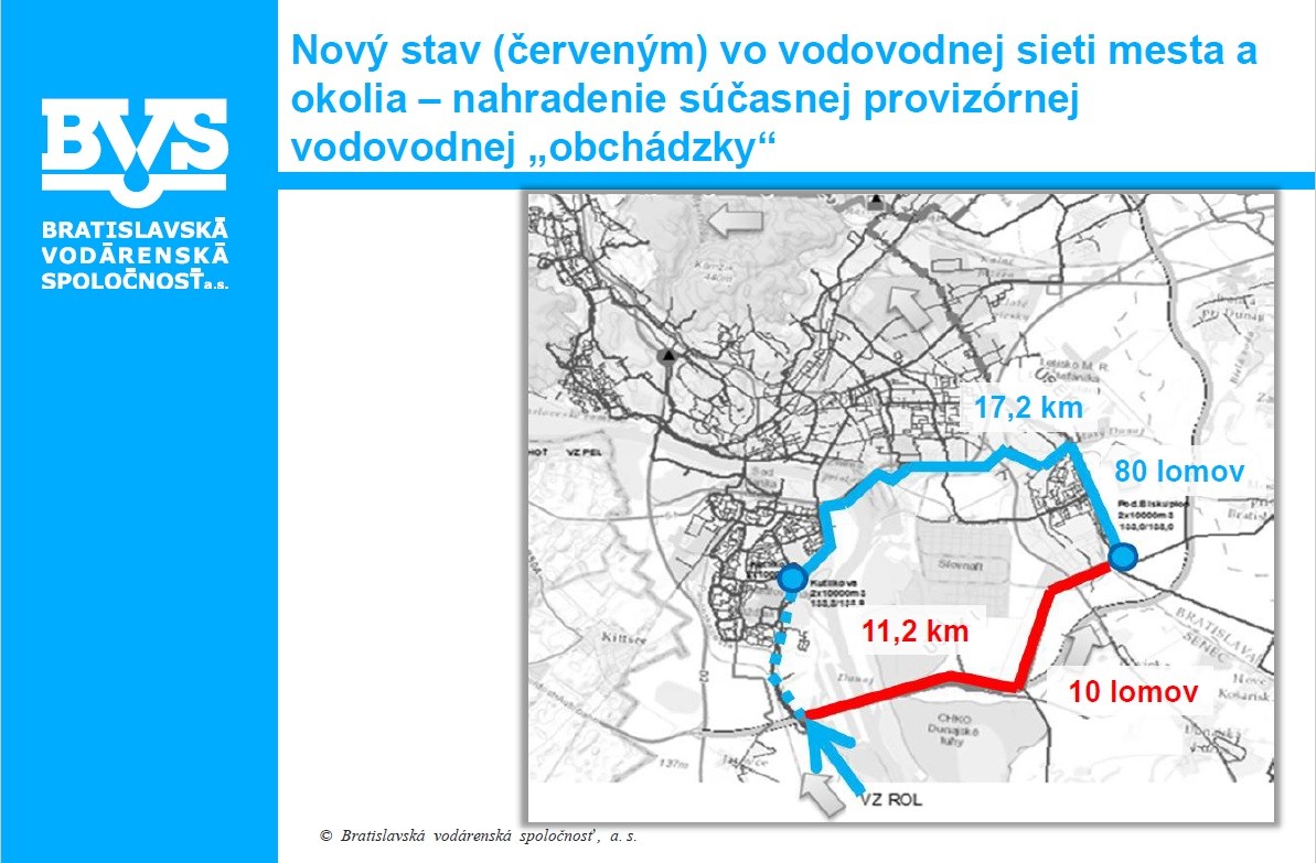 Modrou je vyznačené doterajšie potrubie a červenou plánované, ktoré sa však nerealizovalo. Časť z nového potrubia, úsek na moste cez Dunaj, mal vybudovať zhotoviteľ obchvatu.