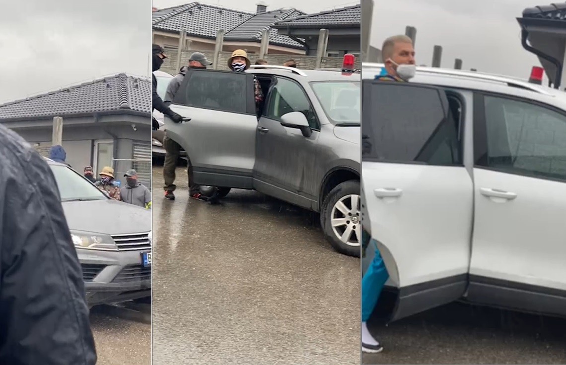 Zuzanu Plačkovú (v klobúku) a jej manžela Reného Strausza odvážajú policajti spred ich domu v Miloslavove.