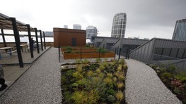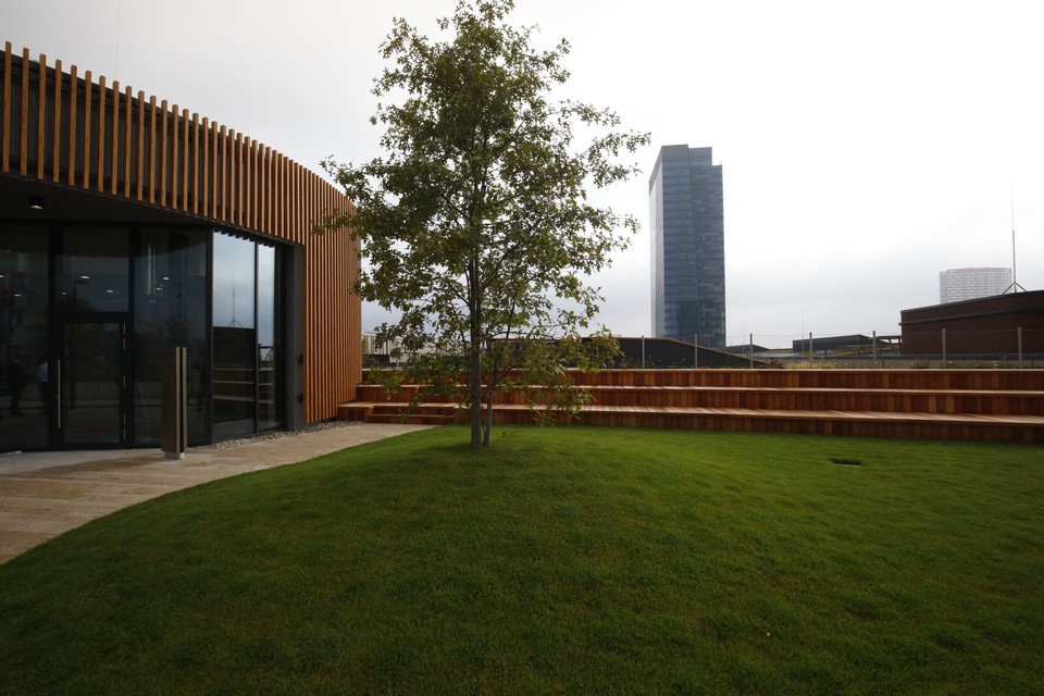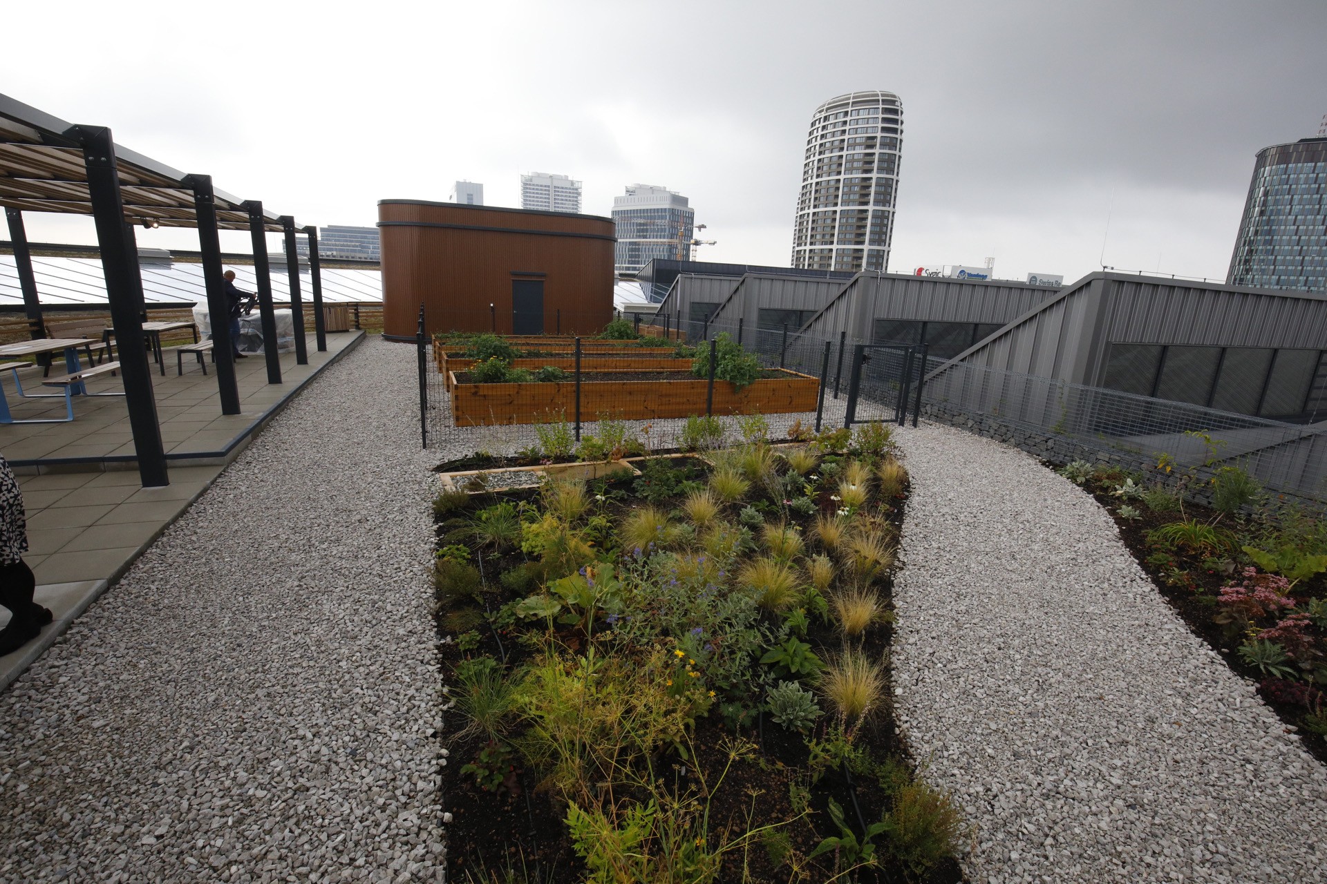 Na verejne prístupne zelenej streche nájdete komunitnú záhradu s pocitovým chodníkom a hmyzím hotelom