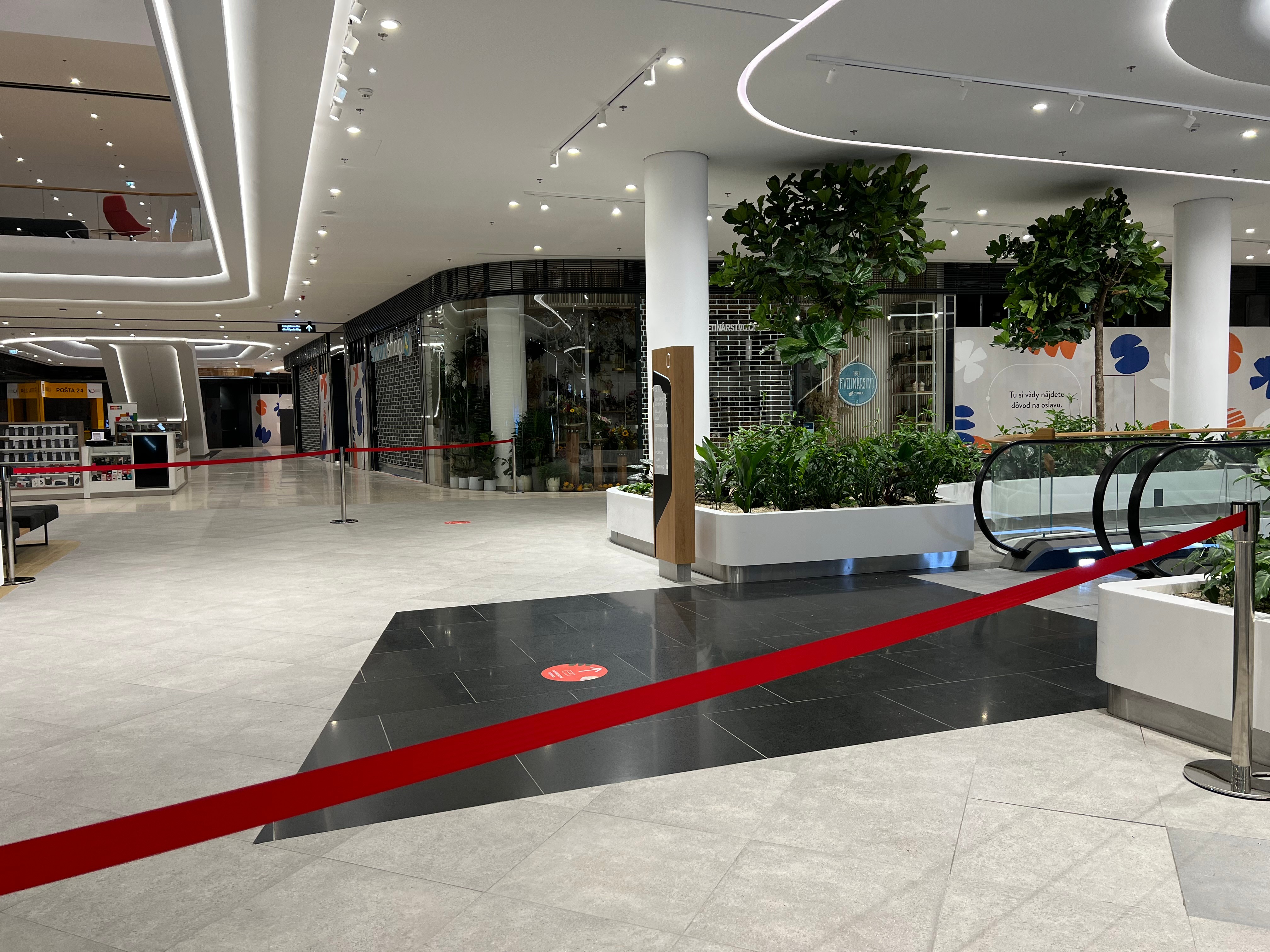 Červená páska určuje, kam nemáte ísť a určuje smer východu smerom k nonstop otvorenému hlavnému vchodu pre peších