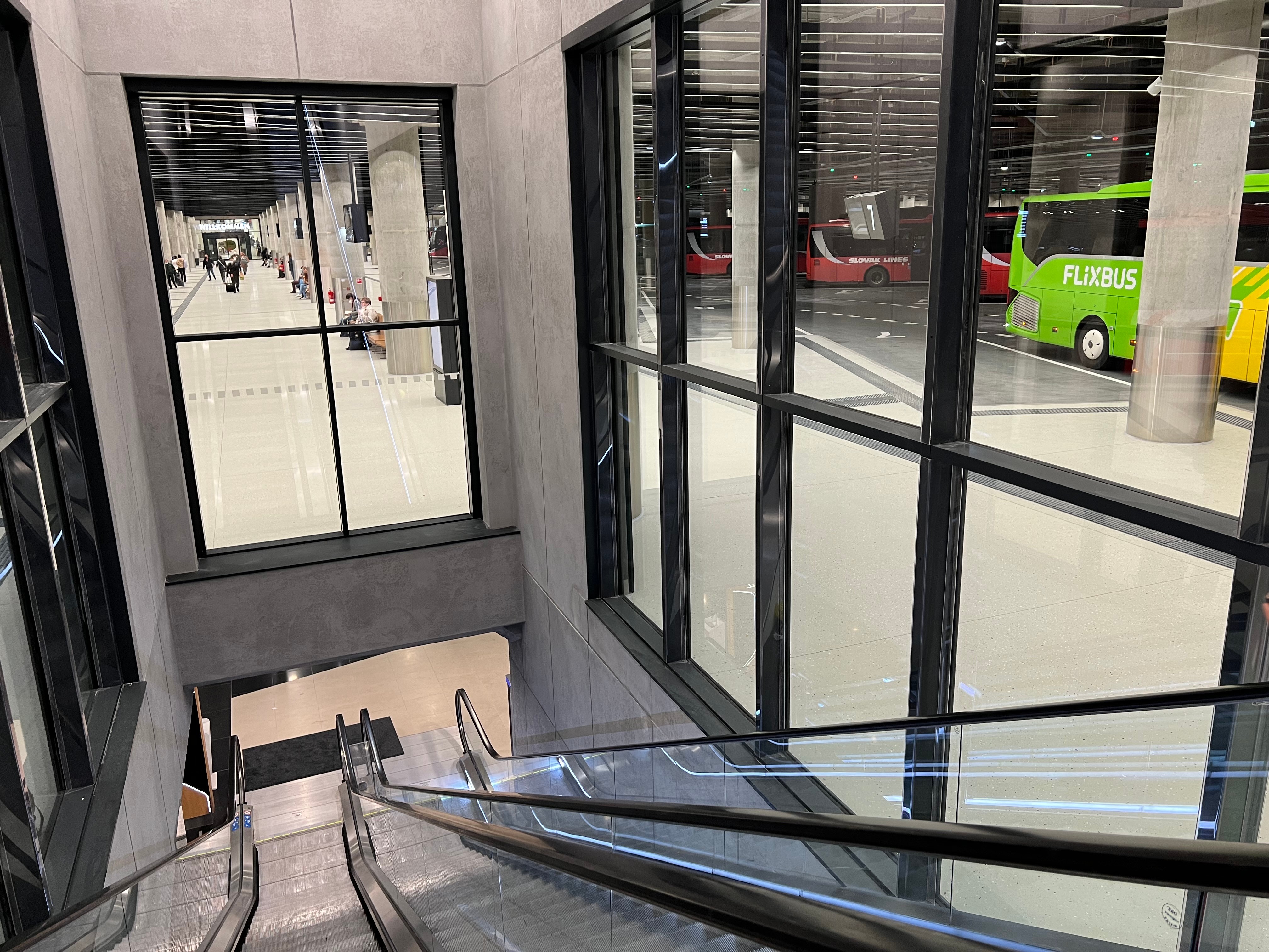 Cestujúci vystúpi, ide do autobusovej haly, kde môže ísť schodiskom alebo eskalátorom