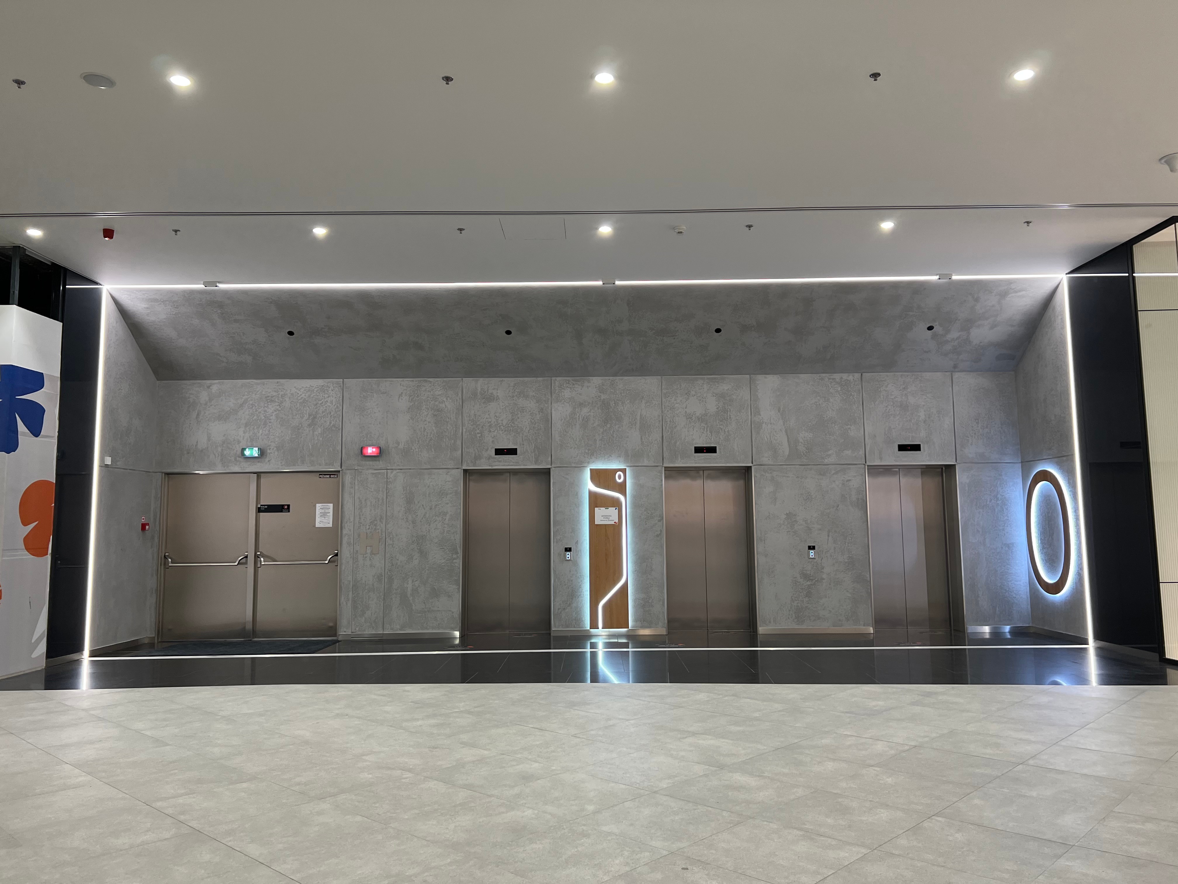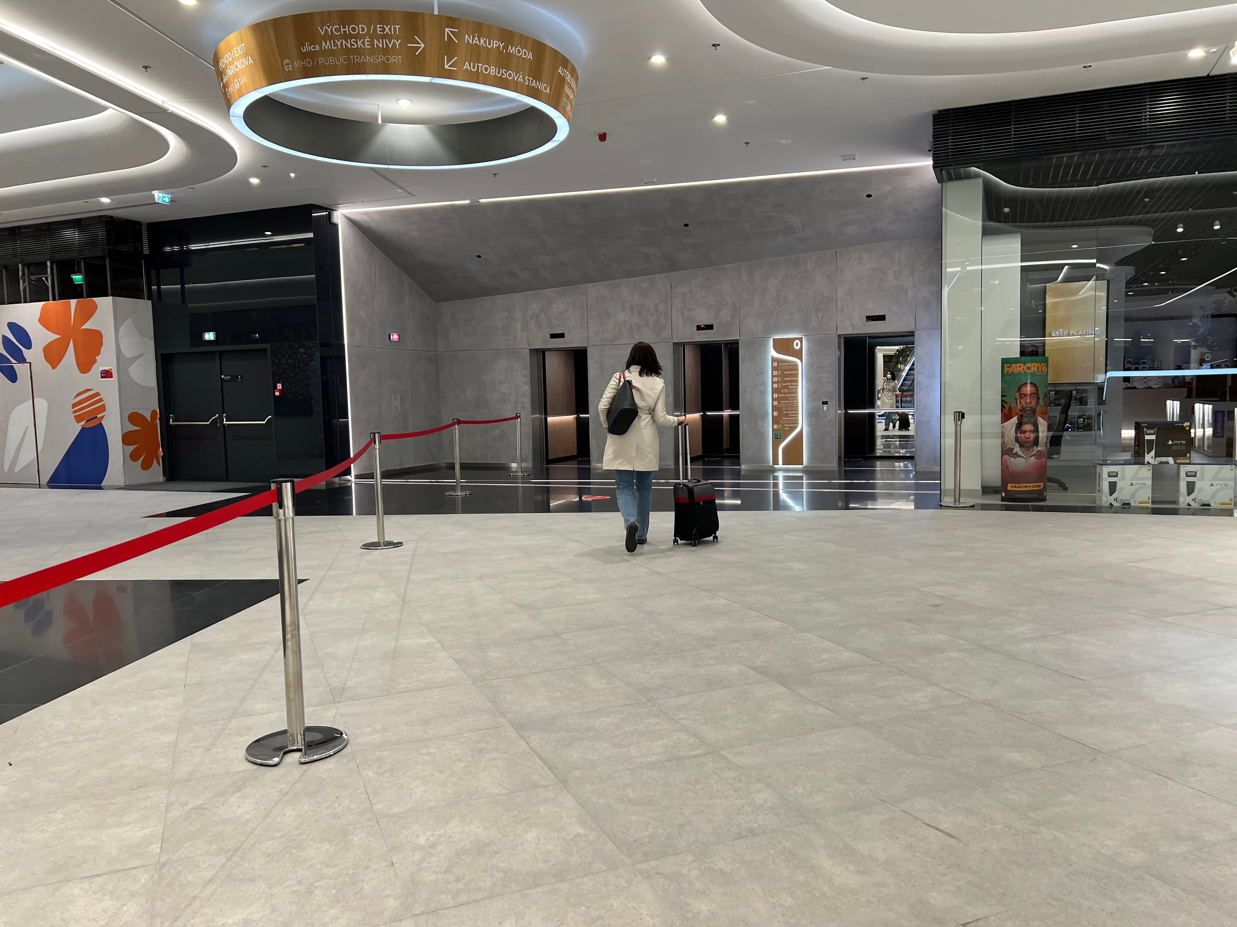 Po vyzdvihnutí cestujúceho sme išli naspäť do foyer budovy, kadiaľ sme prišli. Môžete ísť schodmi alebo eskalátorom, keďže sme mali kufor, šli sme eskalátorom a po vystúpení sme boli navigovaní červenými páskami, ktoré upozorňujú, ktorá časť budovy je zatvorená a navedie vás von. Smerová tabuľa navigovala na parkovisko k výťahom, tie však nefungovali. Ďalšie výťahy sme nakoniec našli po ceste k východu z hlavného vchodu. Dostali sme sa do garáže, auto však bolo na opačnom konci garáže.