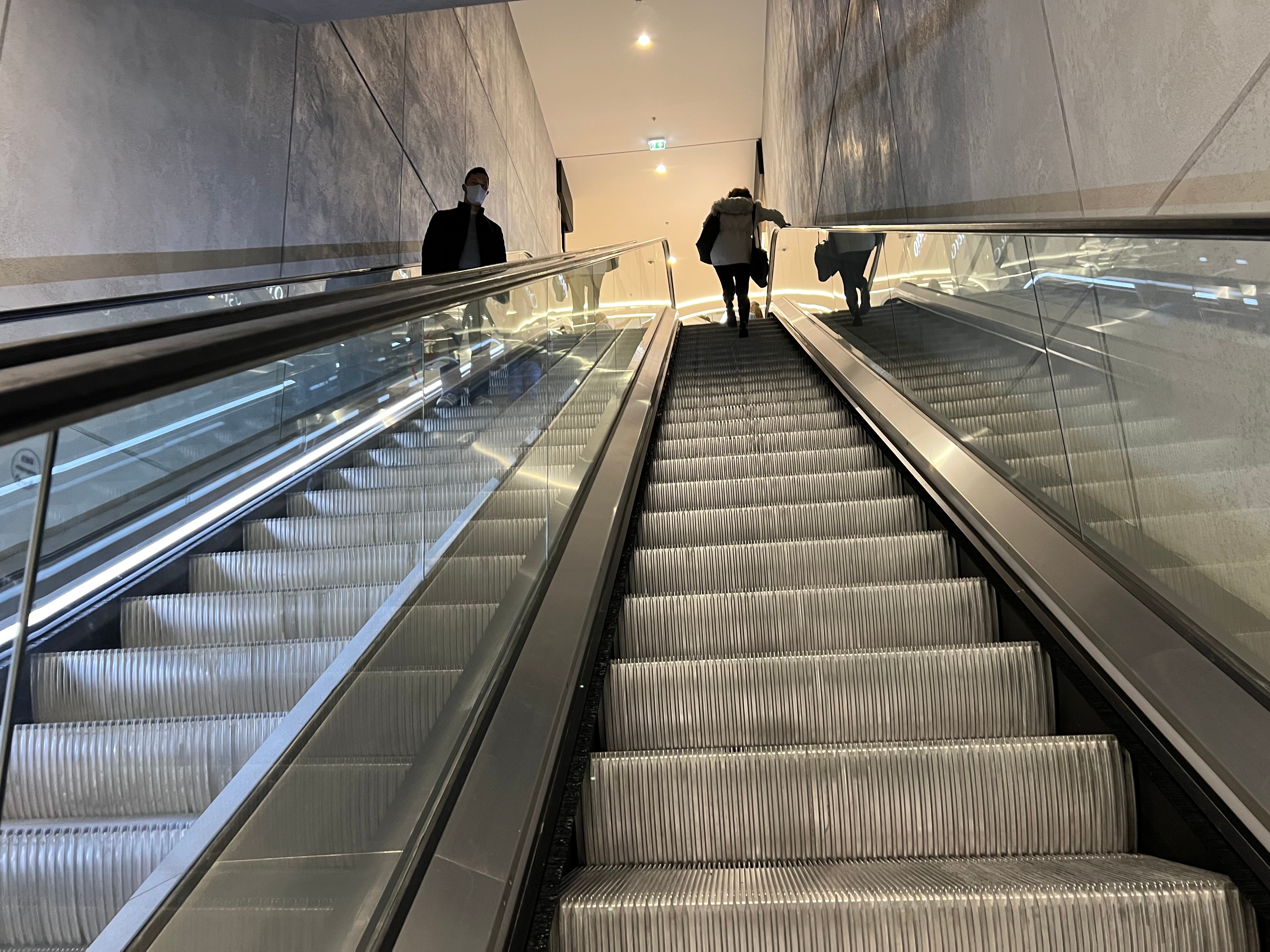 Počas cesty na eskalátore vidíte nástupištia, vystúpiť však nemôžete.