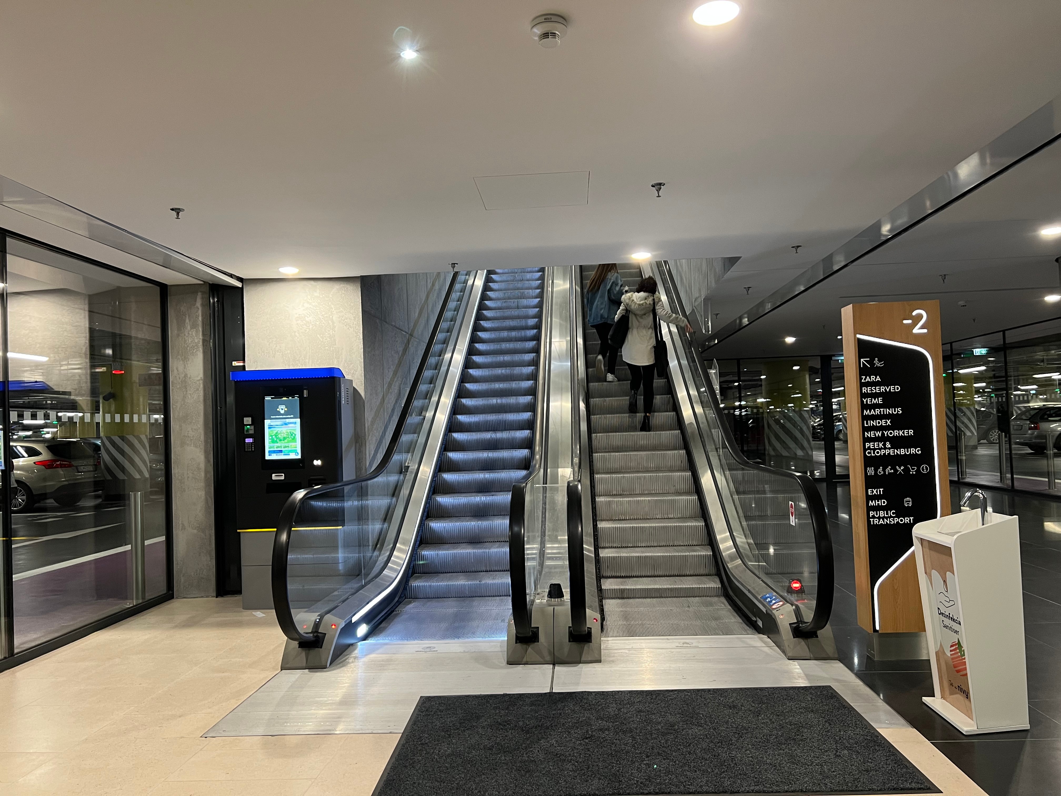 Aj smerová tabuľa nás po vystúpení z eskalátora navigovala na parkovisko k výťahom, ktoré však boli vypnuté