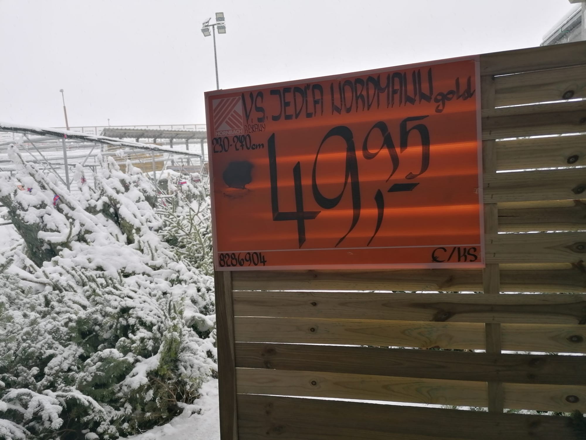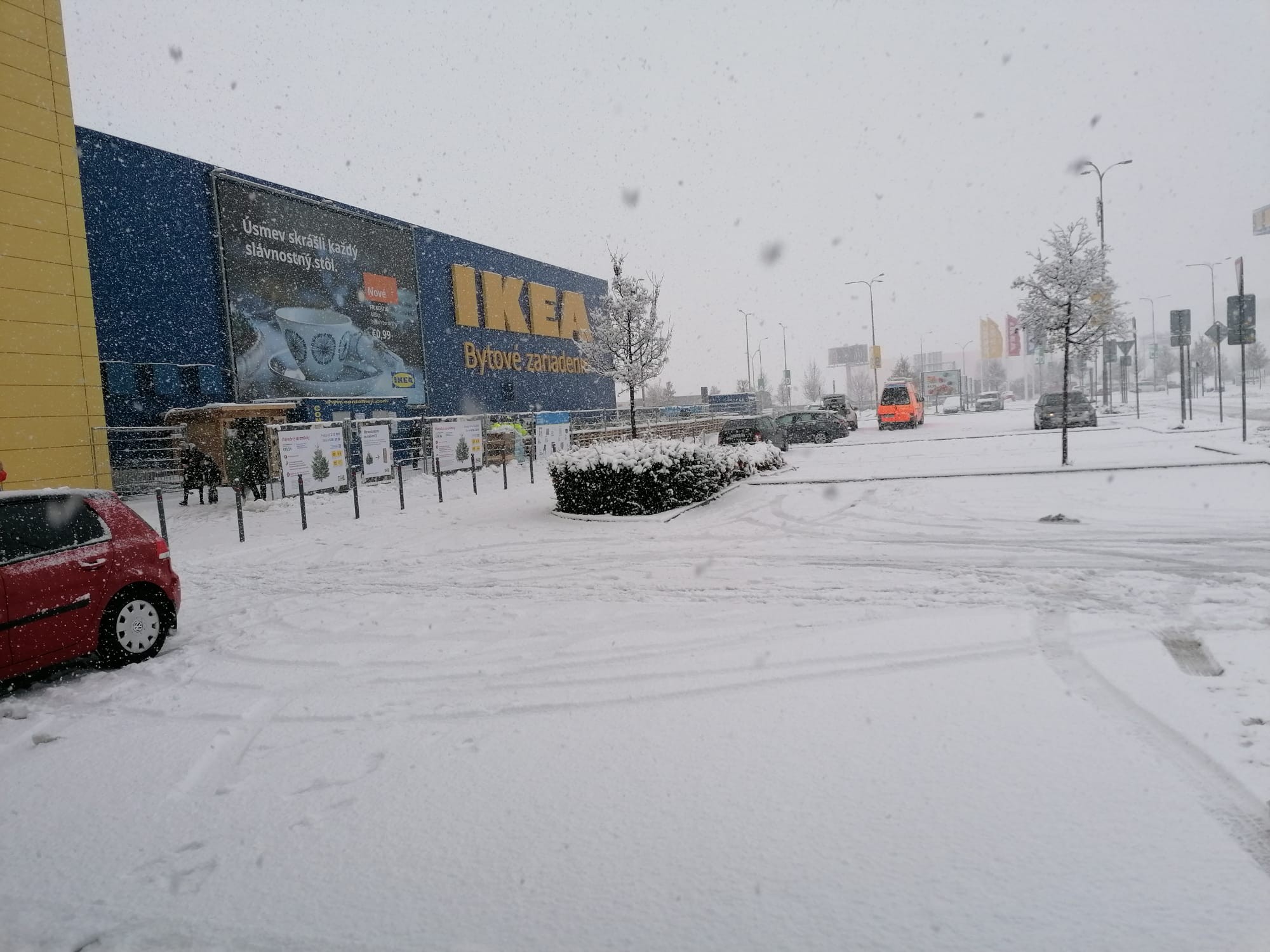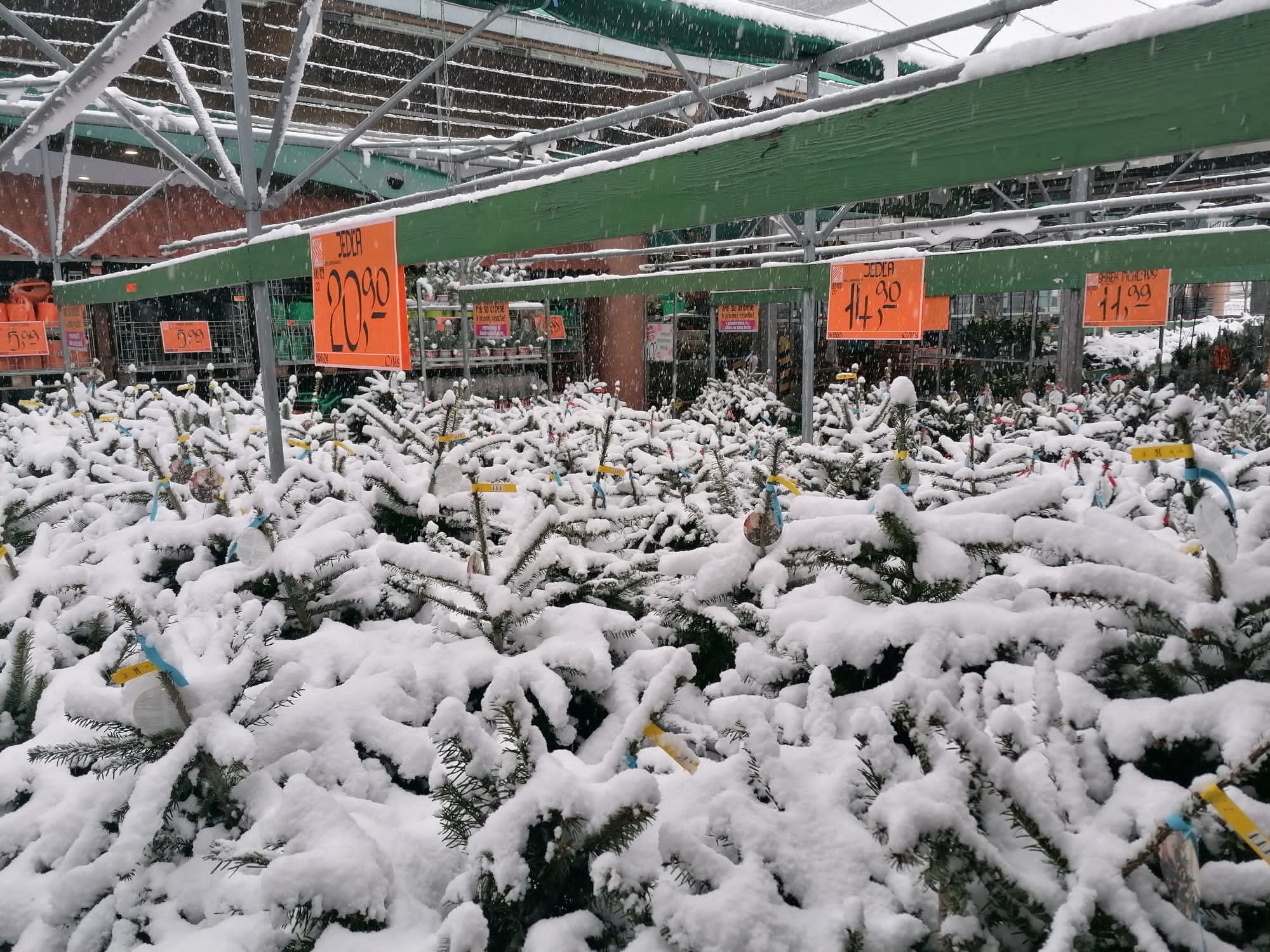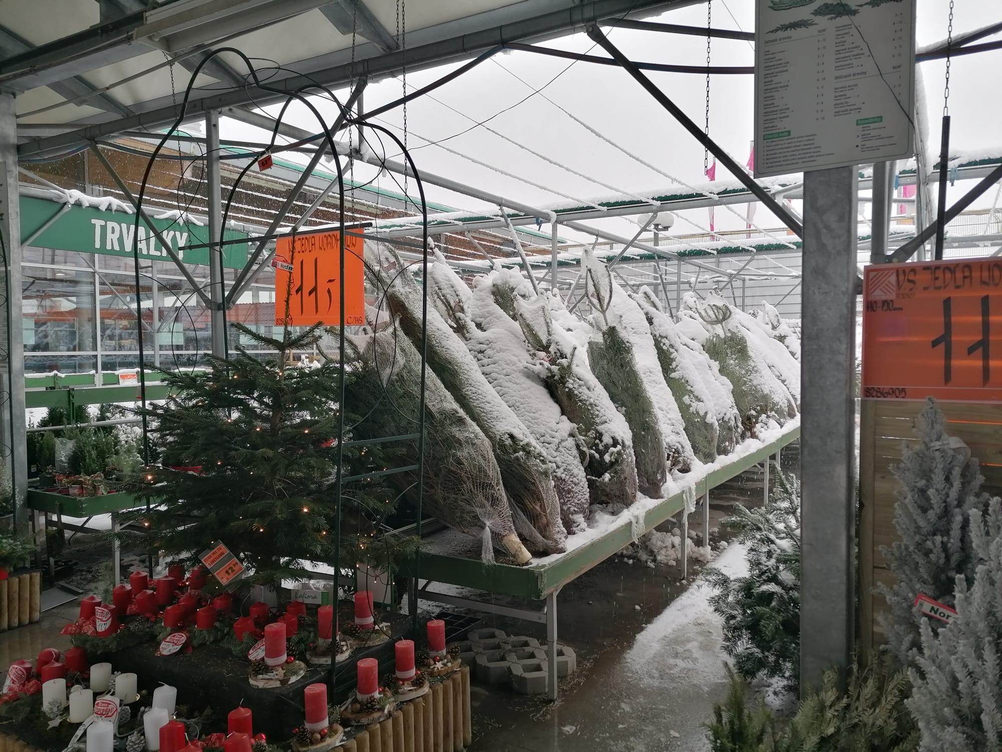 Snehová nádielka neobišla ani záhradné centrum na Ivanskej ceste, stromčeky v Hornbachu už stihli zapadnúť snehom