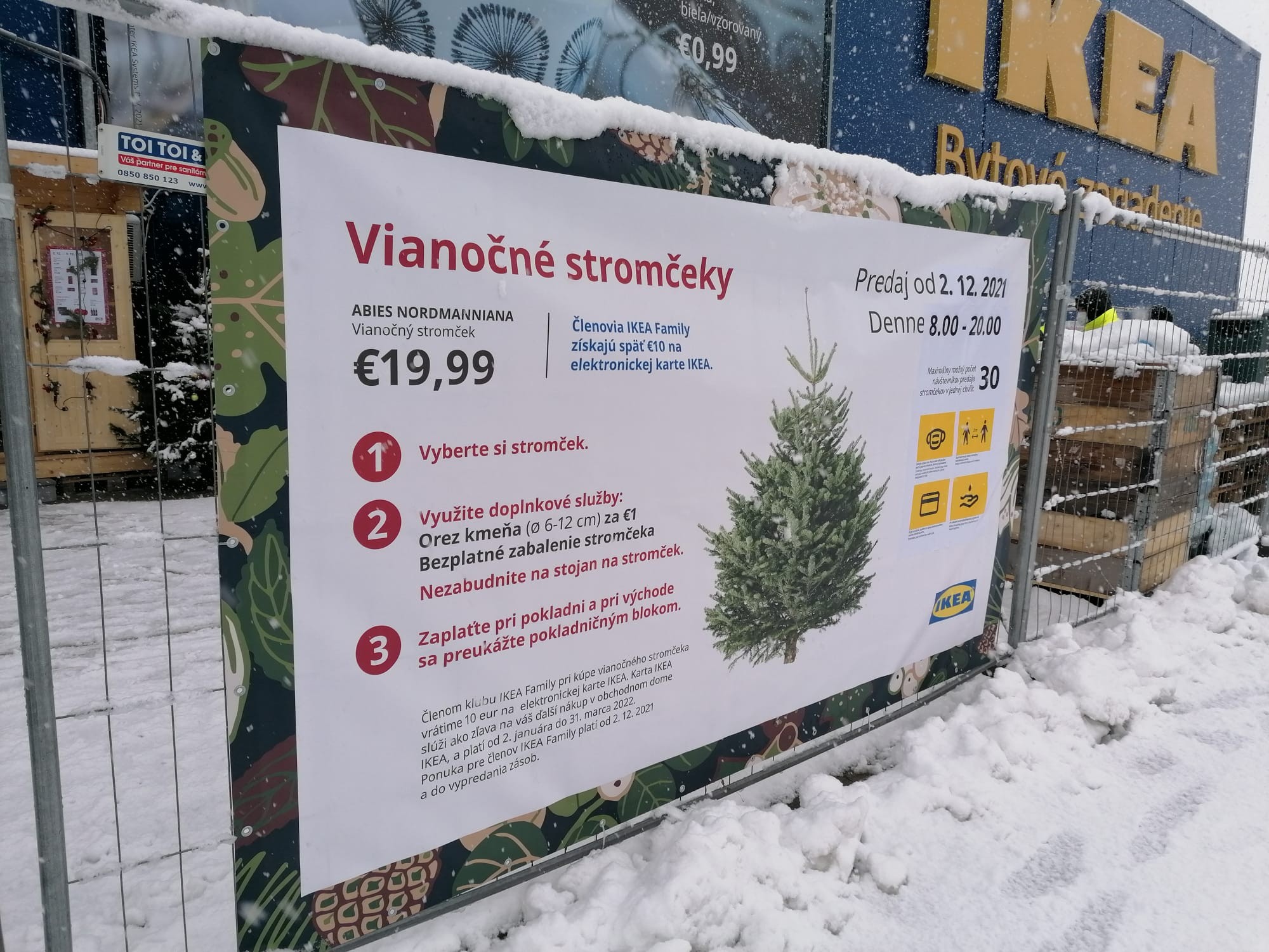 Vianočné stromčeky predávajú aj pred obchodným domom Ikea. Stromček tu stojí 19,99 eur, bezplatne vám ho zabalia, využiť môžete aj doplnkovú službu ako orez kmeňa za euro. Aj Ikea skrátila otvárací čas, stromček si tu môžete kúpiť od 8-20 hodiny, kedy začína platiť zákaz vychádzania.