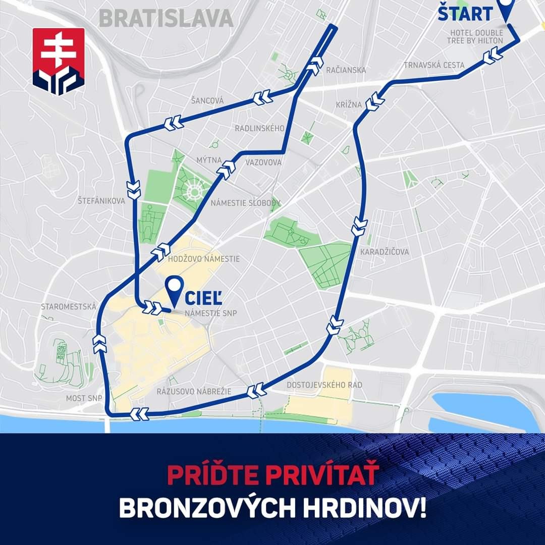 "Jazda autobusu by mala trvať trištvrte hodiny až hodinu. Počas nej budú môcť fanúšikovia na uliciach pozdraviť našich bronzových hrdinov. O zábavu na palube sa postará moderátor Marcel Forgáč. Očakávame, že hokejisti vystúpia na Námestí SNP približne o 16.30 h. Dovtedy bude čakajúci dav zabávať ďalší moderátor Tomaggio aj s pomocou hudobného doprovodu. Následne sa obaja moderátori spoja na pódiu, aby aj s pomocou hokejových reprezentantov vytvorili hodinovú šou pre fanúšikov," informuje SZĽH.