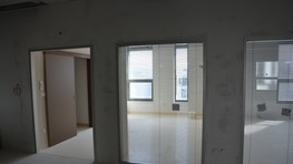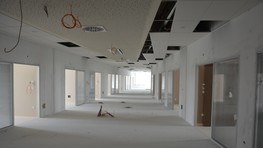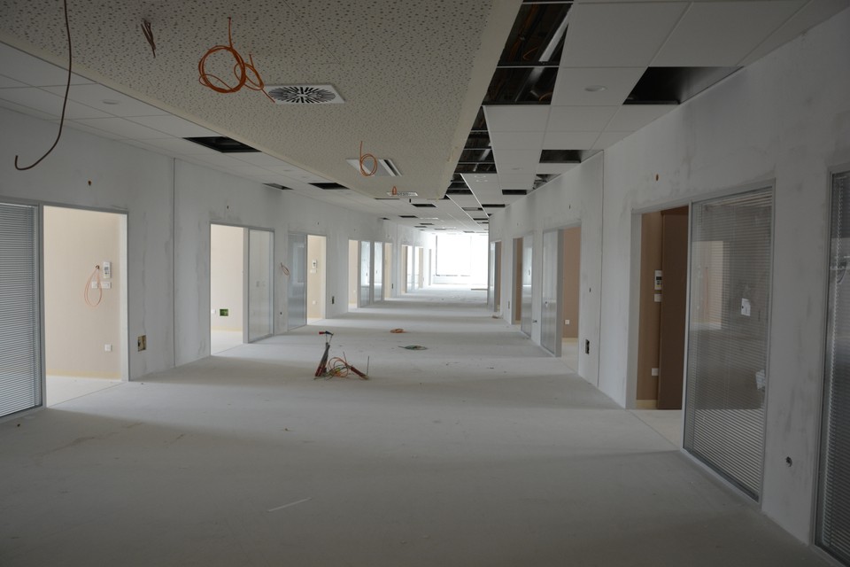 Chodba s nemocničnými izbami. Na každom oddelení bude 36 izieb, kapacita je 403 nemocničných lôžok v celej nemocnici, budú sa nachádzať na treťom a štvrtom podlaží.
