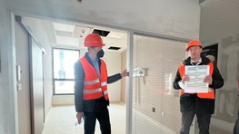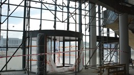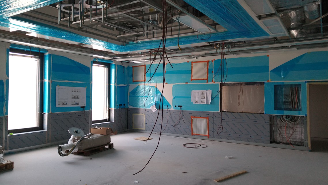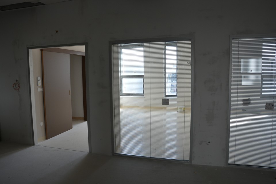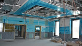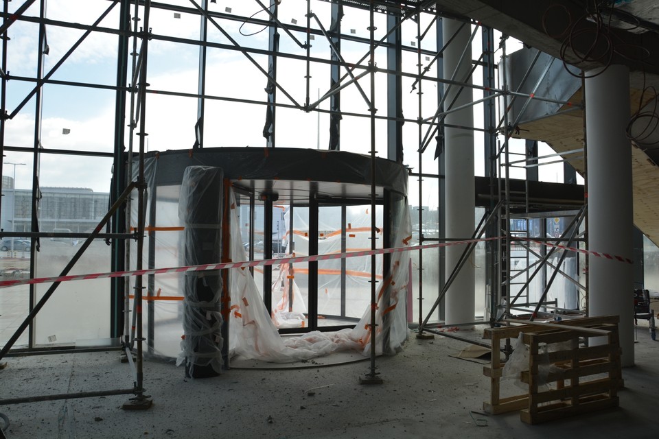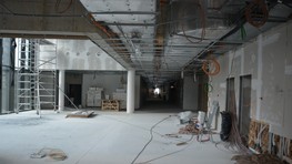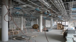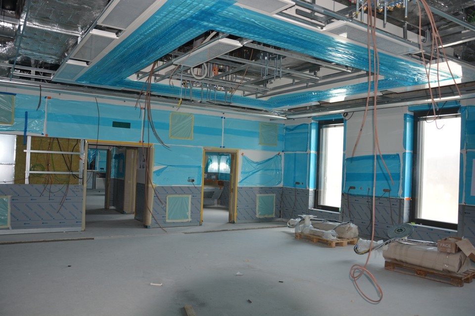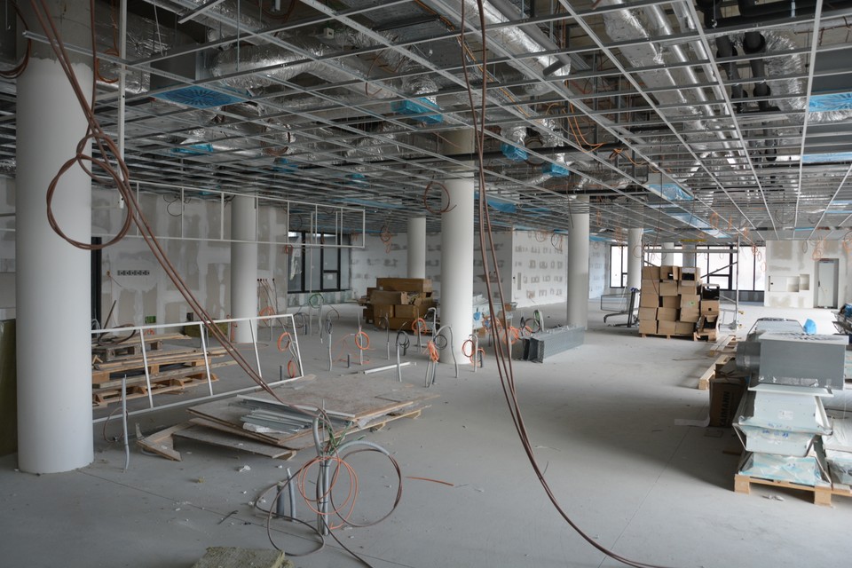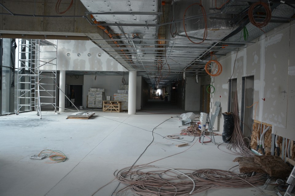 Na tomto podlaží sú ešte otvorené stropy. Z celej výšky 3-metrového stropu 1,5 metra tvoria rozvody, potrubia či iná vzduchotechnika. Z celej budovy tvoria technologické inštalácie 1/3. V tejto časti bude hlavný vstup do nemocnice a centrálna recepcia.