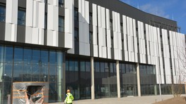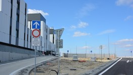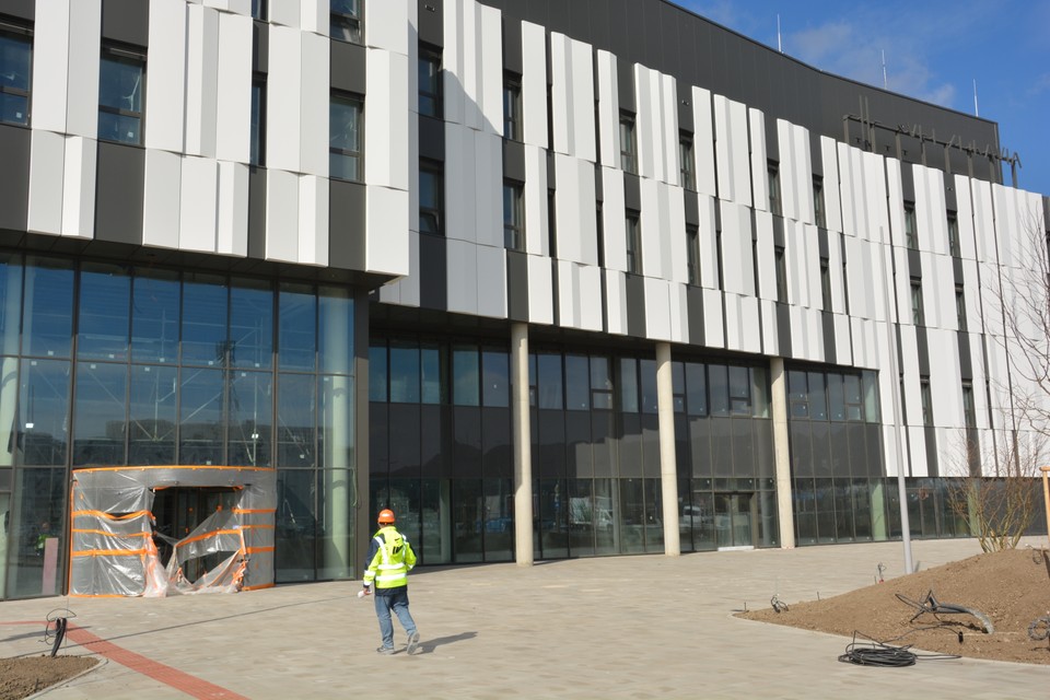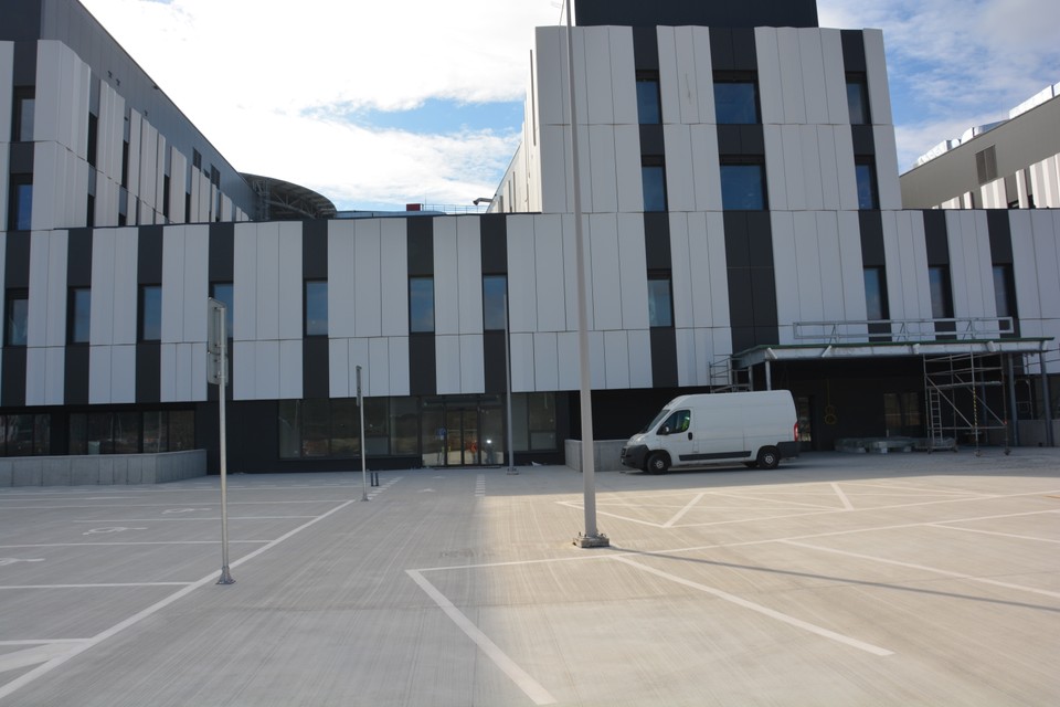 Hlavný vstup do budovy. Nemocnica bude obsahovať 5 podlaží, jej zastavaná plocha je 53-tisíc m2.