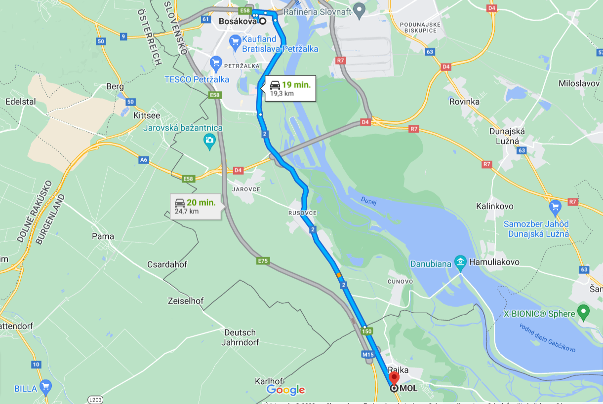 Z Petržalky to máte do Rajky cca 20 minút, ak nejdete v čase najväčších zápch.