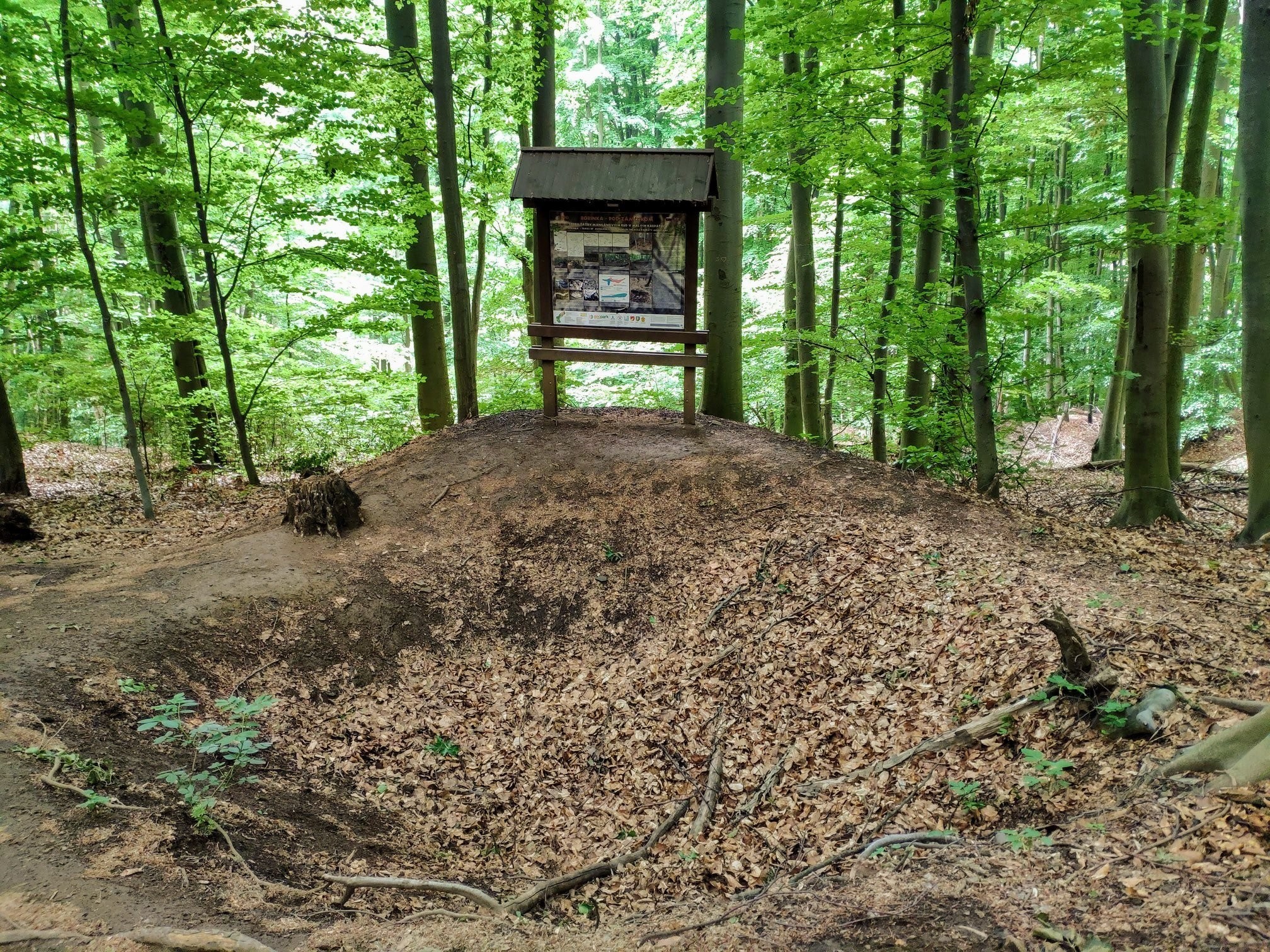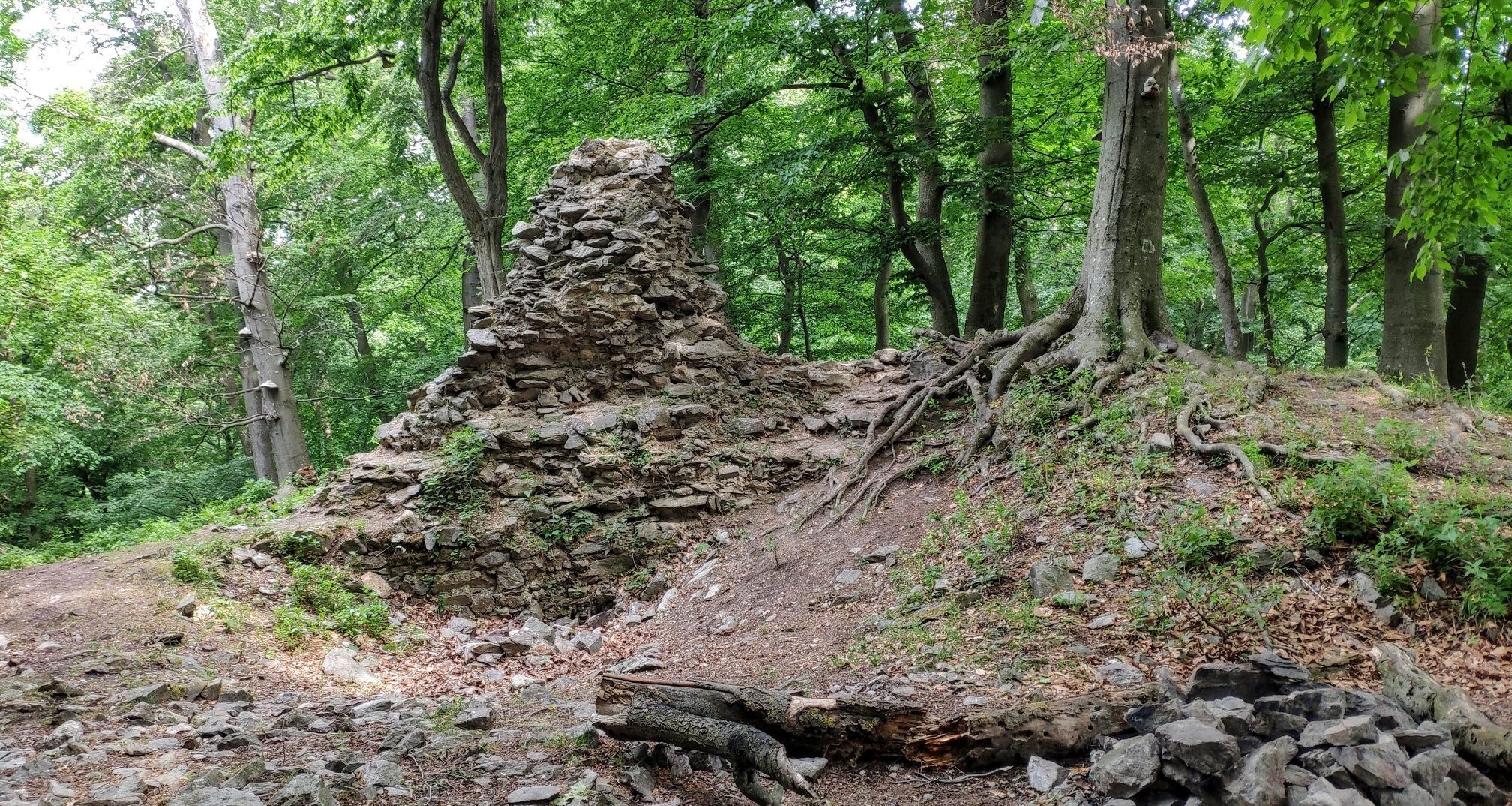 Od brány hradu Pajštún budete pokračovať ďalej po žltej turistickej značke najprv jemne stúpate na kopec Kozlisko do výšky 537 m.n.m., a odtiaľ stále po žltej značke začnete klesať príjemným terénom až k odbočke k zrúcanine Dračieho hrádku. K zrúcanine je to odtiaľto cca 200 m, stoji za to si ju pozrieť. Viac info o Dračom hrádku nájdete tu. Od Dračieho hrádku sa vrátite späť na križovatku a pokračujete klesajúc do údolia. Kúsok pod Dračím hrádkom je pozostatok ťažby mangánových rúd aj s informačnou tabuľou Geoparku.