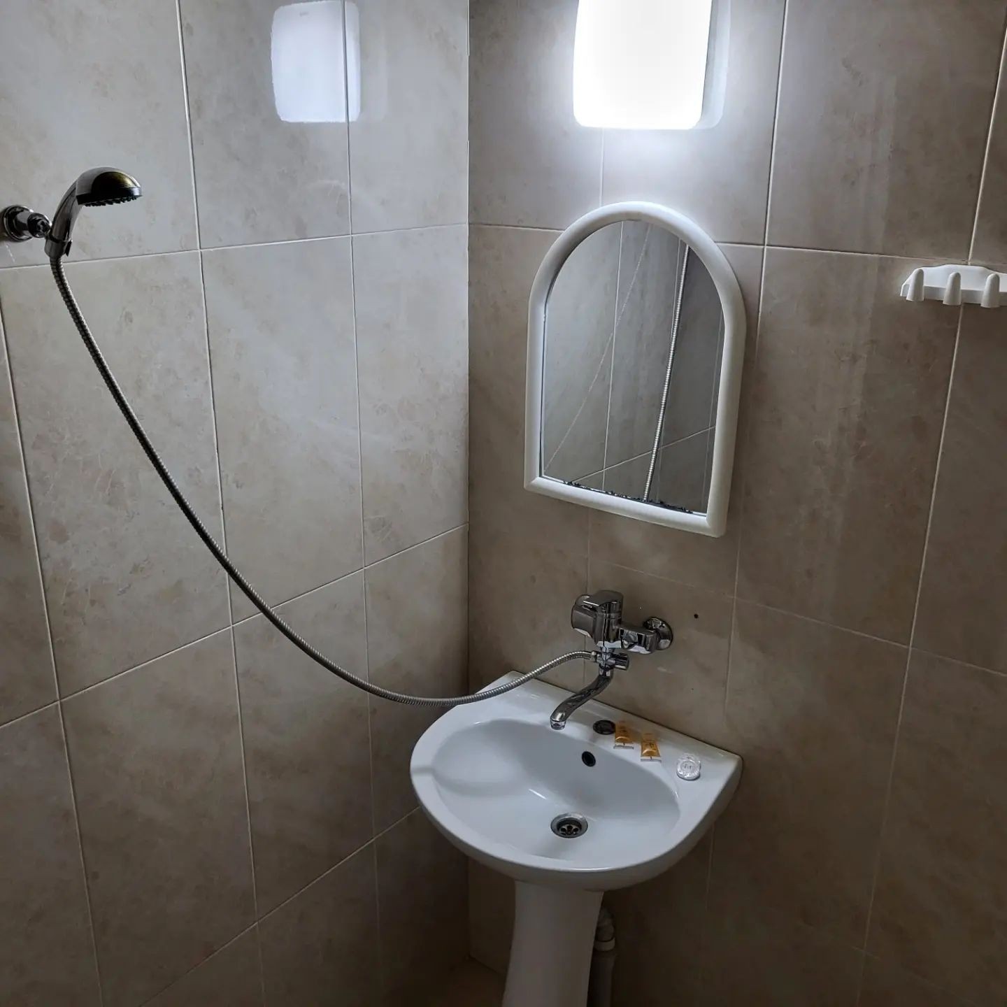 Riešenie hotelovej kúpeľne, sprcha je natiahnutá z umývadla.