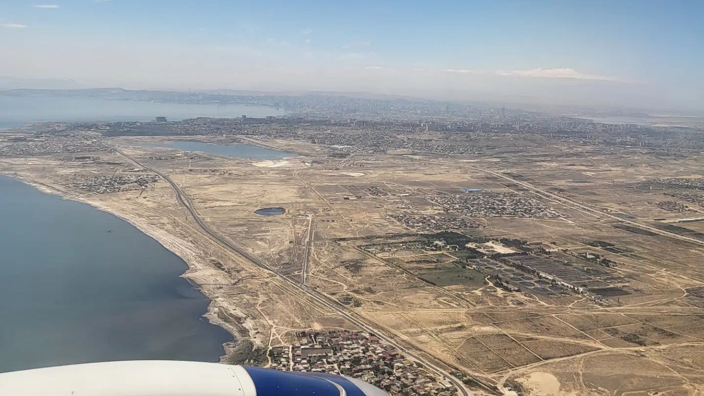 Pohľad na krajinu pri lete z Gruzínska do Azerbajdžanu.