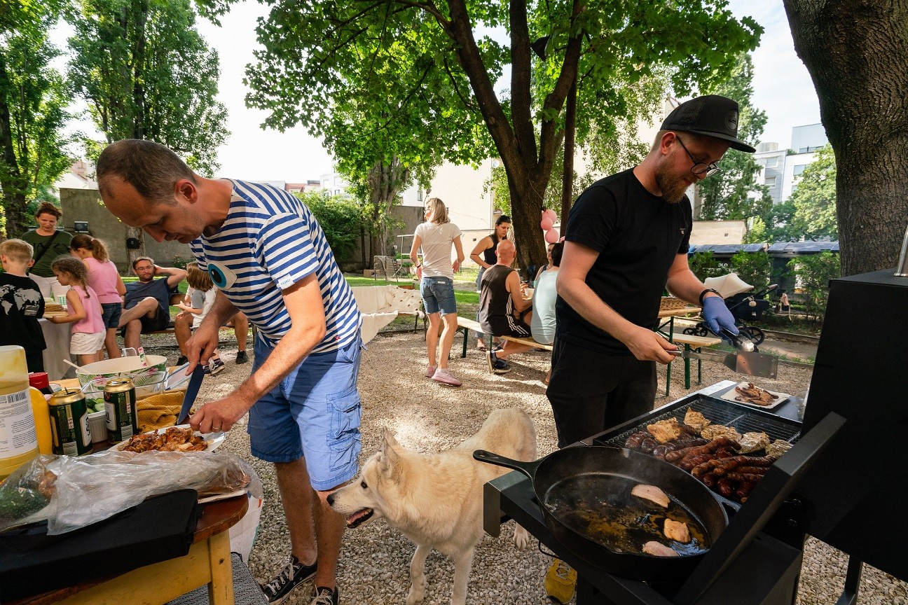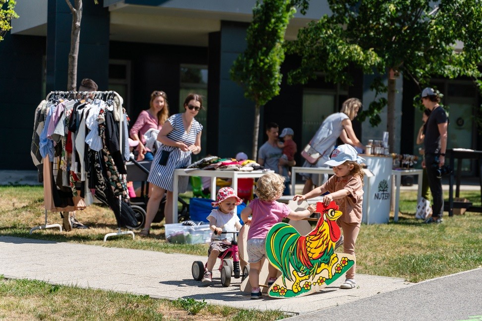 Foto 1 - 4: Počas Víkendu bratislavských dvorov si susedia na dvore na Záhrebskej ulici aj vo vnútrobloku na Špitálskej zorganizovali oslavy MDD, v komplexe NUPPU sa na dvore uskutočnil swap oblečenia aj malé predajné trhy a vo vnútrobloku Jedno staromestské átrium chystali svoj dvor na letné aktivity.
