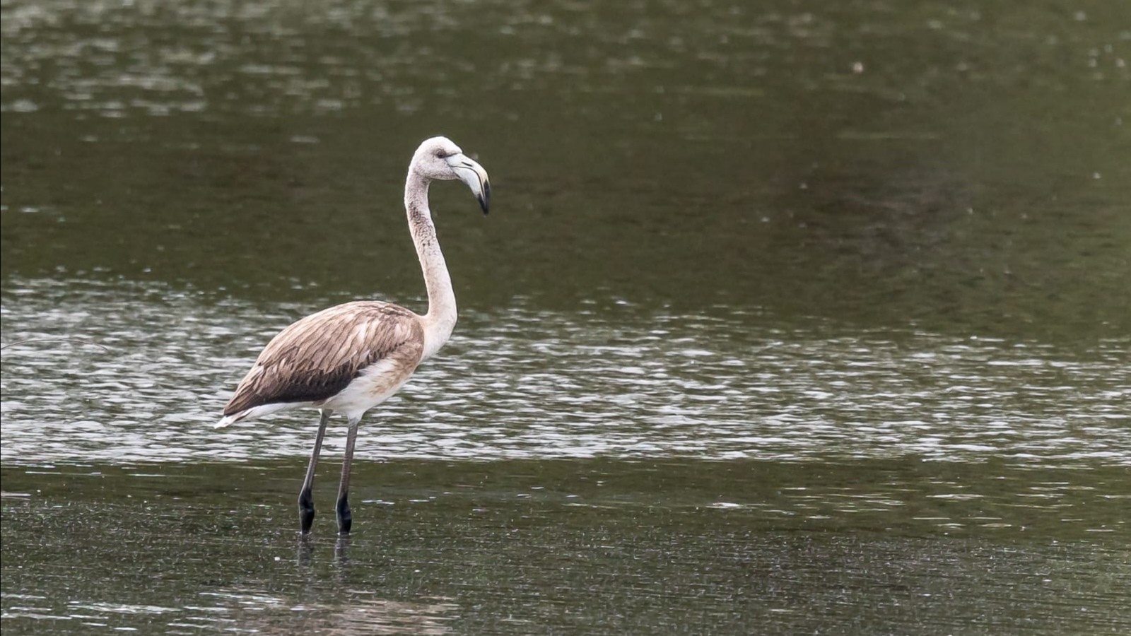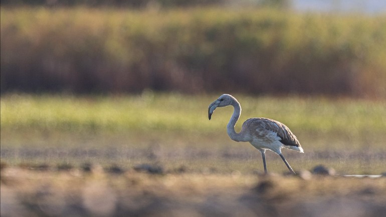 Priletí aj do Bratislavy? Plameniak v Trnavskom kraji. Ide o mladého zatiaľ skôr sivého jedinca, ružovú farbu dospelých jedincov spôsobujú pigmenty v ich potrave.