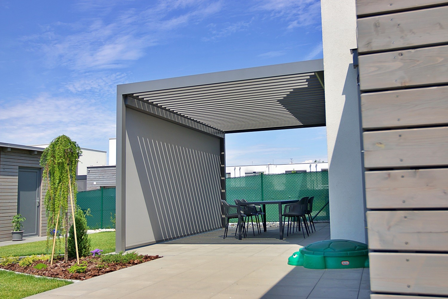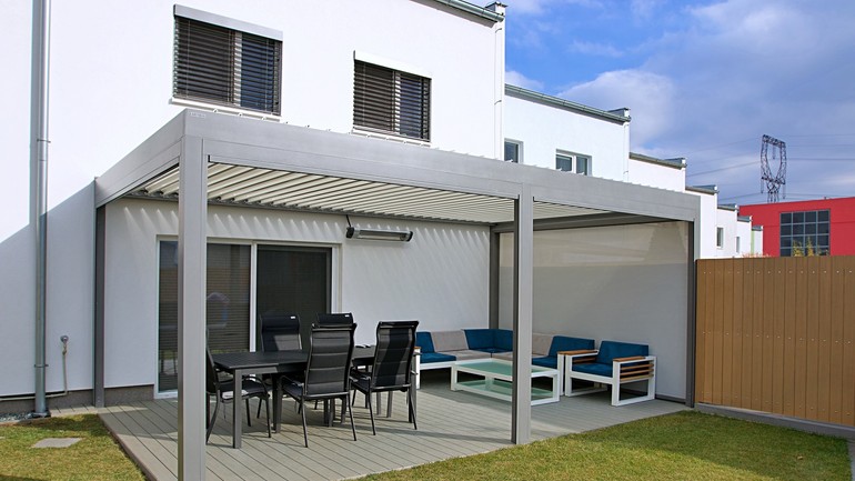Čo sa týka umiestnenia pergoly, môže stáť samostatne alebo byť sčasti ukotvená k domu a vytvárať tak efektné zatienenie terasy. Zboku pergoly je možné namontovať screenovú roletu, ktorá nielenže ochráni pred hmyzom a vetrom, ale zabezpečí aj súkromie, nakoľko je cez ňu len veľmi málo vidieť. Pergola môže byť doplnená integrovaným osvetlením.