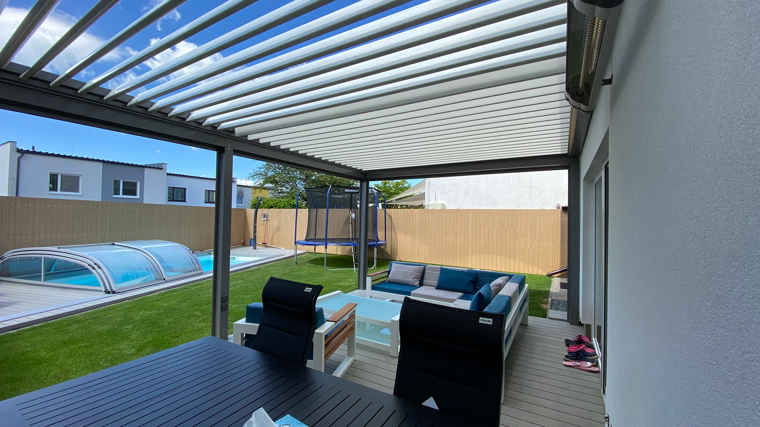 Zhrnuté a podčiarknuté, hliníková bioklimatická pergola je jednoduchým, takmer bezúdržbovým a estetickým riešením zastrešenia terasy. Chráni pred ostrým slnkom, vetrom i dažďom a umožňuje tráviť čas na čerstvom vzduchu za každého počasia. Je ideálnym priestorom na relax pri káve, posedenia s rodinou a priateľmi ale napríklad aj na nerušený home office. Defakto predstavuje zväčšenie obývateľného priestoru domu o jednu ďalšiu miestnosť.
