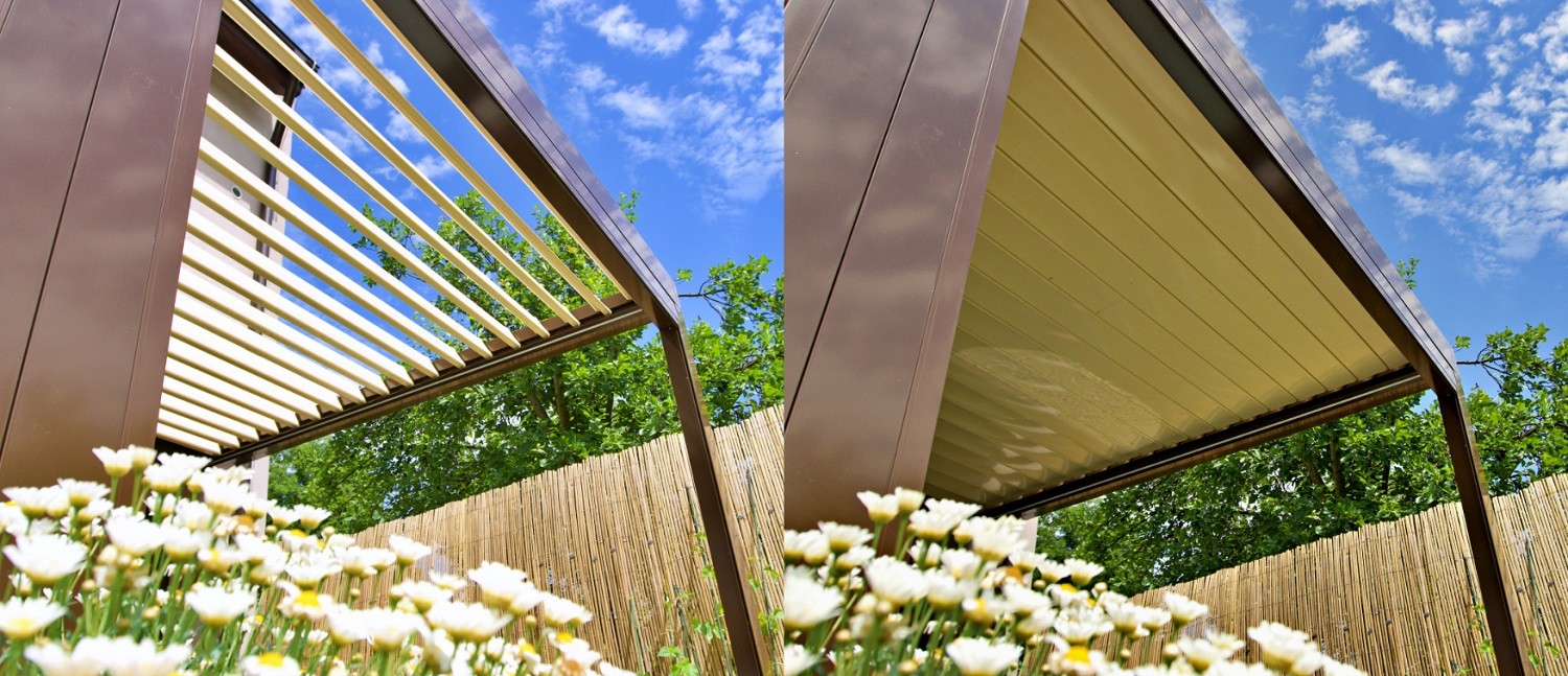 Obrovskou výhodou takejto pergoly je pohyblivý strešný slnolam. Ten podľa poveternostných podmienok nakloní strešné lamely tak, aby vám v každom počasí bolo pod pergolou príjemne. Keď vám to vyhovuje, lamely môžu byť sklonené zhruba kolmo a prepúšťať okolo 50% priameho slnečného svetla. Počas teplých letných dní, keď chcete mať pod pergolou príjemný chládok, môžete sklonom lamel úplne zabrániť priamemu slnečnému svitu.