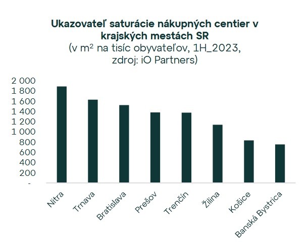 Spomedzi všetkých krajských miest sa vyznačuje najväčšou koncentráciou moderných nákupných centier Bratislava. Potvrdzujú to aj aktuálne údaje spoločnosti iO Partners, podľa ktorých bola na konci prvého polroka 2023 výmera nákupných centier v Bratislave na úrovni 728 tis. štvorcových metrov. Z celkovej plochy moderných nákupných centier v krajských mestách SR tak pripadal na Bratislavu 48 % - ný podiel. Nasledovali Košice a Nitra s podielmi 13 % a 10 %.