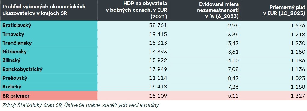 Podľa údajov Ústredia práce, sociálnych vecí a rodiny sa Bratislavský kraj zároveň vyznačuje najnižšou mierou nezamestnanosti. Kým v júni 2023 dosiahla evidovaná miera nezamestnanosti v tomto regióne 2,95 %, v ostatných krajoch sa pohybovala od 3,35 % v Trnavskom kraji až po 8,47 % v Prešovskom kraji.