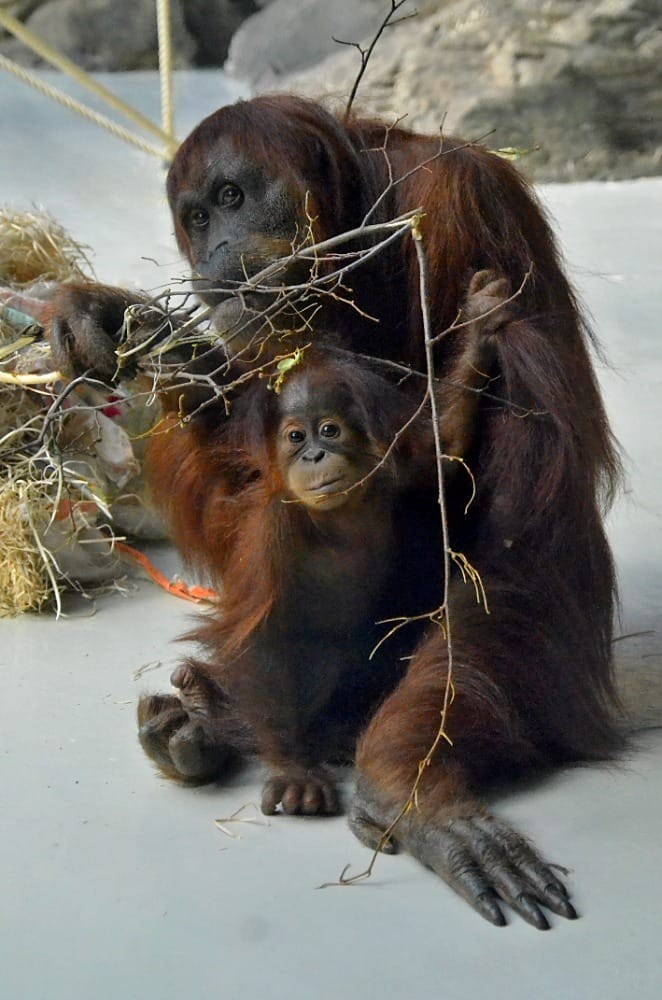 Samica orangutana s mláďaťom v zoologickej záhrade v Bratislave