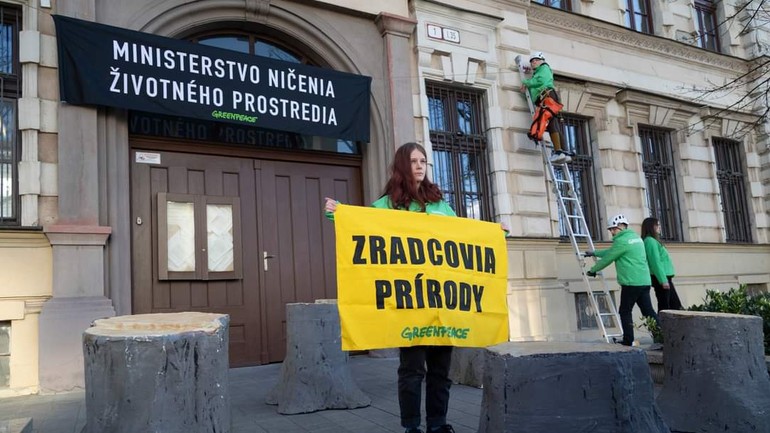 Aktivisti z organizácie Greenpeace Slovensko na protest vyliezli na budovu Ministerstva životného prostredia (MŽP) SR a prekryli jeho názov transparentom Ministerstvo ničenia životného prostredia.