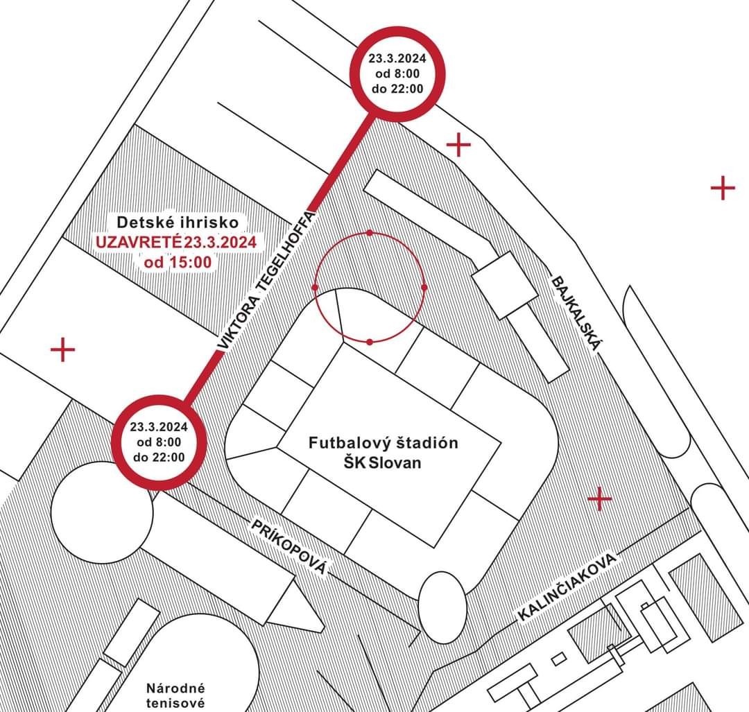 Obojsmerná uzávera Ulice Viktora Tegelhoffa pre zápas na Národnom futbalovom štadióne v Bratislave medzi reprezentáciami Slovenska a Rakúska potrvá do 22.00 h. "Dopravné obmedzenie sa môže týkať aj ulíc v blízkosti štadióna, a to Bajkalskej a Vajnorskej ulice, z dôvodu presunu fanúšikov na nevyhnutne potrebný čas," dodala polícia.