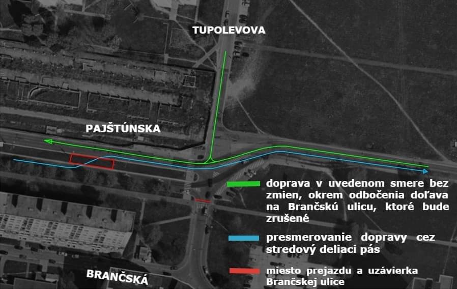 Zároveň informuje, že obchádzková trasa bude realizovaná z dôvodu uzávery Brančskej ulice. Pajštúnska ulica bude presmerovaná do opačnej strany cez stredový pás.
