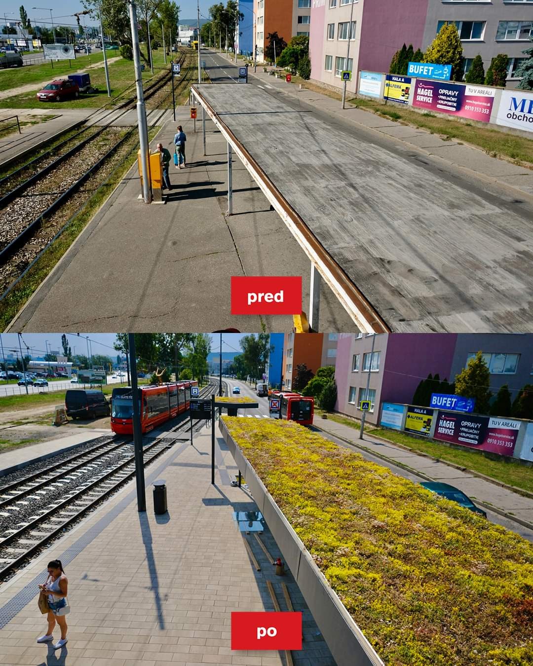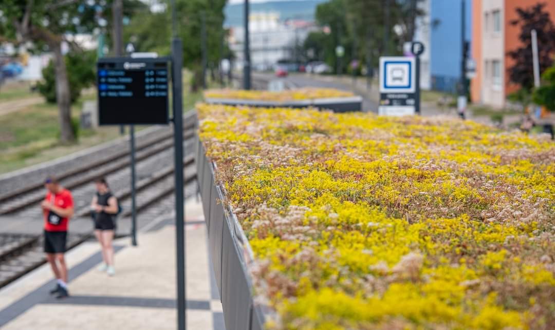 Súčasťou projektu sú aj nové prístrešky na združenej zastávke pre električky a autobusy na Zlatých pieskoch. Na strechy prístreškov vysadili bezúdržbový rozchodník, ktorý okrem estetickej funkcie pomáha brániť prehrievaniu strechy prístreška v letných mesiacoch. Počas zrážok bude vrstva substrátu plniť vodozádržnú funkciu, a preto nie je nutné ani dodatočné zavlažovanie tohto rozchodníka. Ide o prvé zelené prístrešky MHD v Bratislave.