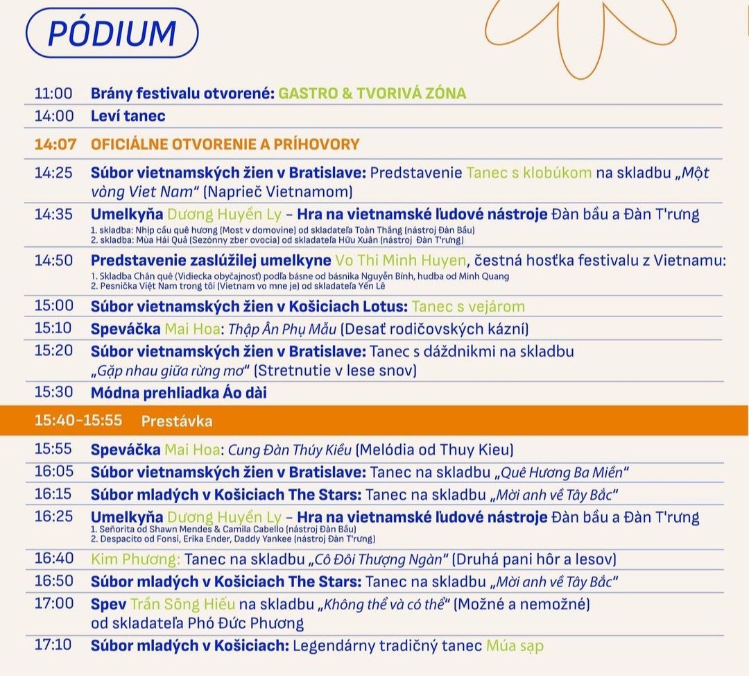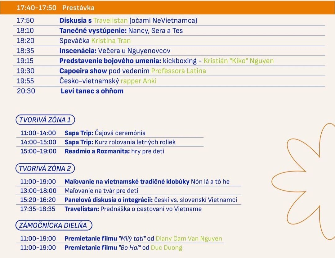 Brány areálu sa otvárajú o 11:00 h, takže na obed si môžete dať tradičné vietnamské špeciality, ale aj menej známe jedlá. Hlavný program na pódiu začína o 14:00 h.