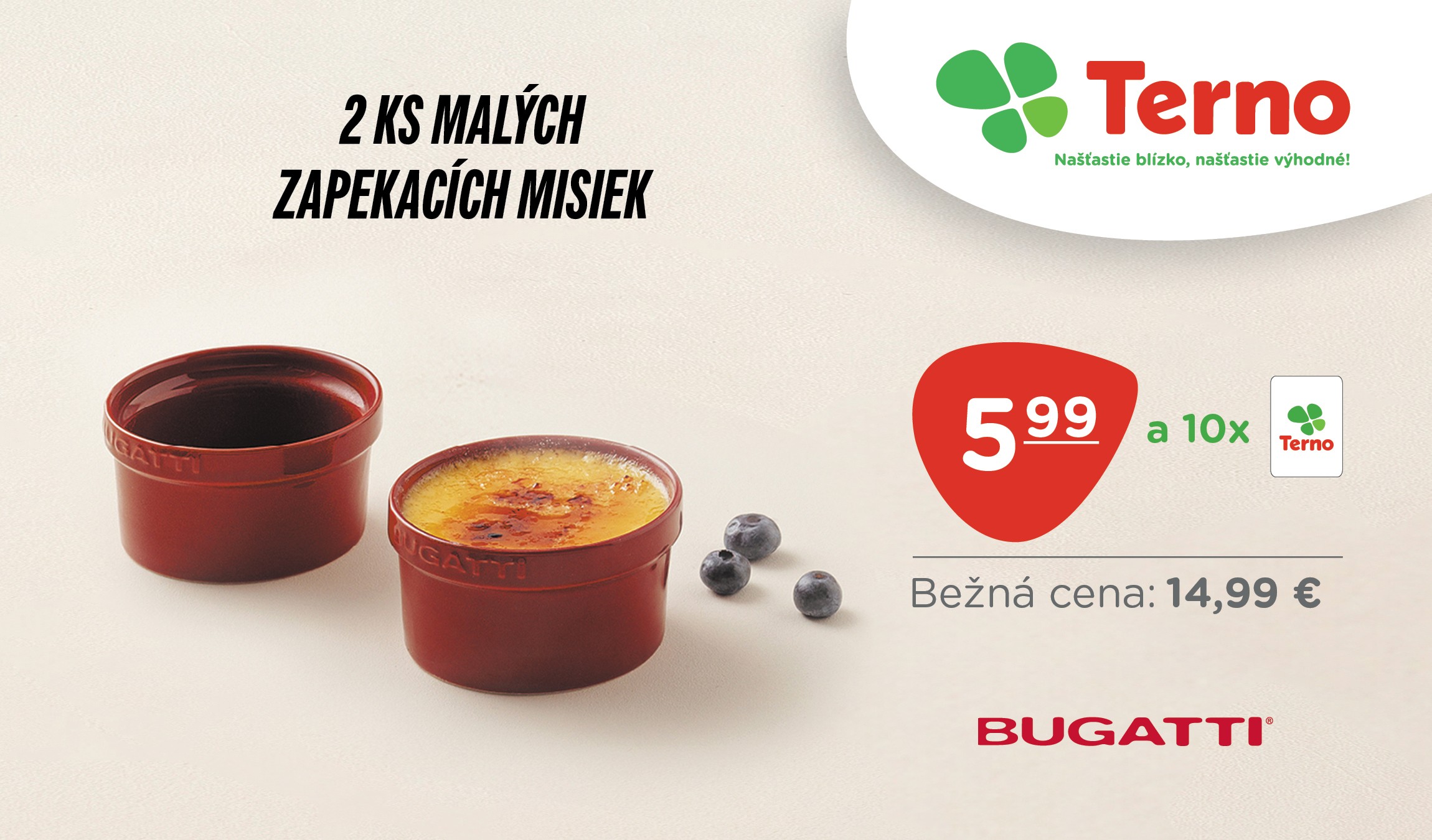 Po úspechu kampaní s majstrovskými nožmi Bugatti a prémiovým riadom Lätt Home, prichádza v slovenskej sieti potravín Terno na rad vernostný program pre milovníkov pečenia, ktorý slovenskému zákazníkovi ponúka funkčné a štýlové riešenia inšpirované reálnym životom. So svojou viac ako 100-ročnou tradíciou, vnáša rodinná firma Bugatti do tepla domova kus tradície i odvahy, ktorá nesmie chýbať žiadnemu pekárovi. Produktová kolekcia na pečenie renomovanej značky je navrhnutá a vytvorená skúsenými inžiniermi a zákazníkom potravinového reťazca Terno sa predstaví v žiarivej červenej farbe evokujúcej hlavnú ingredienciu pečenia, ktorou je láska.