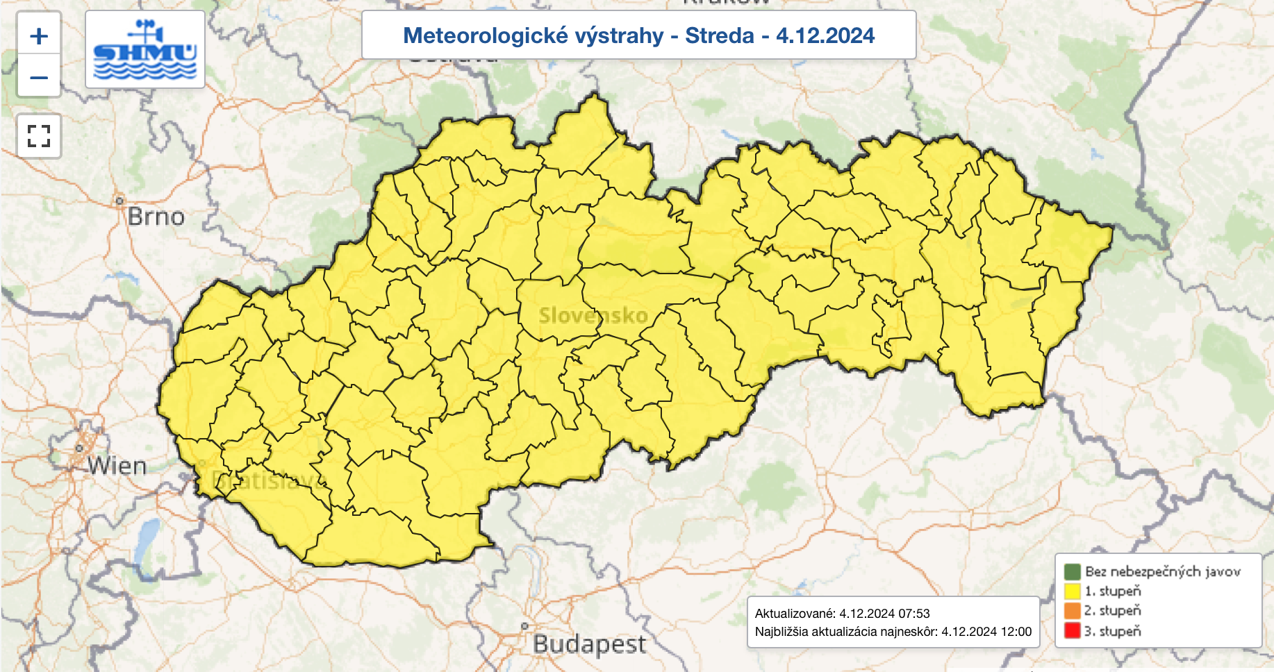 Hmla s dohľadnosťou 50 až 200 metrov sa môže ojedinele vyskytnúť vo všetkých okresoch vrátane Bratislavy. "Znížená dohľadnosť predstavuje potenciálne nebezpečenstvo pre dopravné aktivity," pripomína SHMÚ. Výstrahy pred poľadovicou platia pre niektoré okresy Žilinského a Prešovského kraja, konkrétne okresy Námestovo, Tvrdošín, Ružomberok, Liptovský Mikuláš, Poprad, Kežmarok a Stará Ľubovňa. "Tvorba poľadovice predstavuje potenciálne nebezpečenstvo pre ľudské aktivity - doprava, pohyb osôb," podotýkajú meteorológovia.